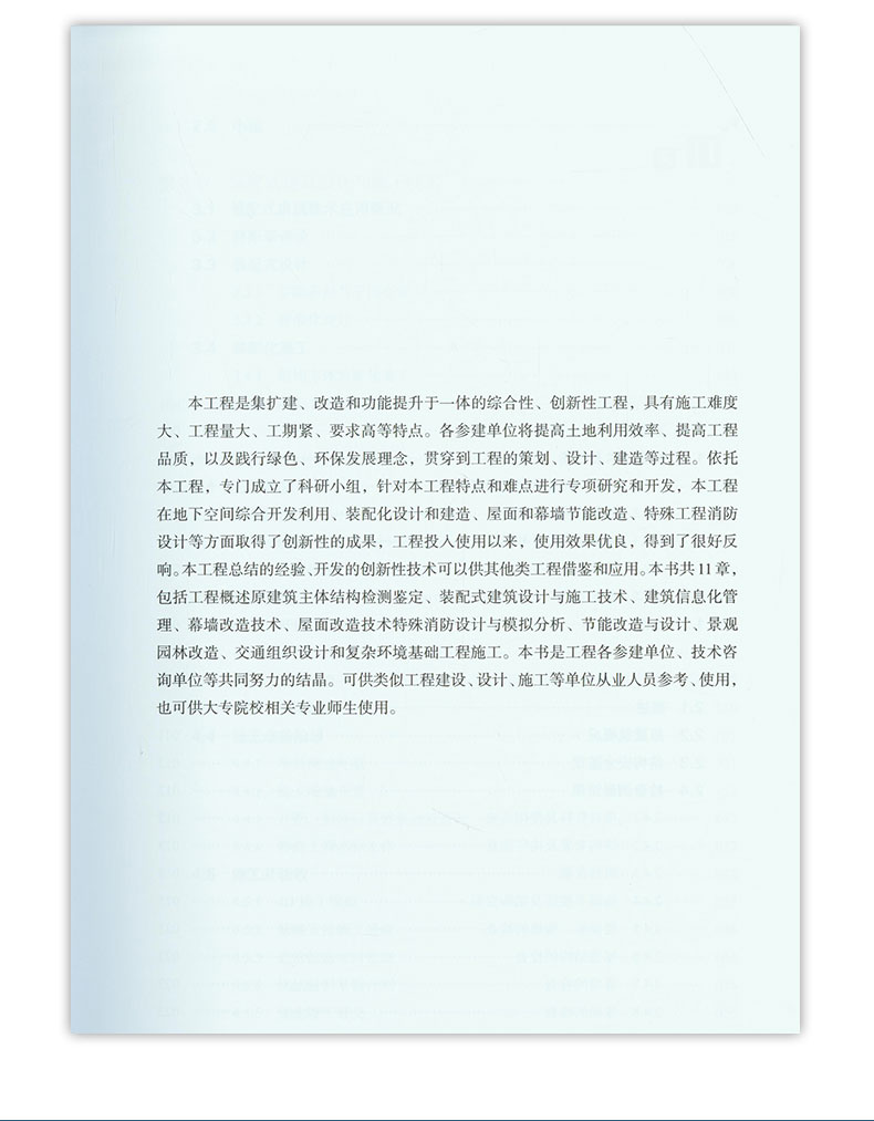 本工程是集扩建、改造和功能提升于一体的综合性、创新性工程,具有施工难度大、工程量大、工期紧、要求高等特点。各参建单位将提高土地利用效率、提高工程品质,以及践行绿色、环保发展理念,贯穿到工程的策划、设计、建造等过程。依托本工程,专门成立了科研小组,针对本工程特点和难点进行专项研究和开发,本工程在地下空间综合开发利用、装配化设计和建造、屋面和幕墙节能改造、特殊工程消防设计等方面取得了创新性的成果,工程投入使用以来,使用效果优良,得到了很好反响。本工程总结的经验、开发的创新性技术可以供其他类工程借鉴和应用。本书共包括十一章,包括原主体结构检测鉴定、装配式建筑设计和施工、建筑信息化管理、幕墙改造技术、特殊消防设计和分析、节能改造设计、景观园林改造、交通组织设计和复杂环境地基基础施工等。本书是各参建单位、技术咨询单位等共同努力的结晶。可供类似工程建设、设计、施工等单位从业人员参考、使用,也可供相关专业大专院校学生使用。