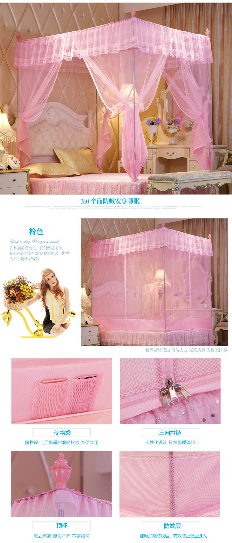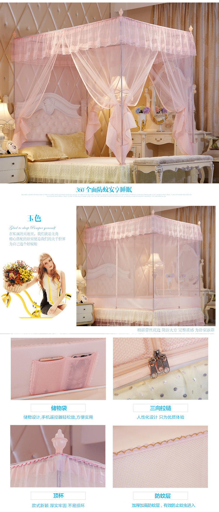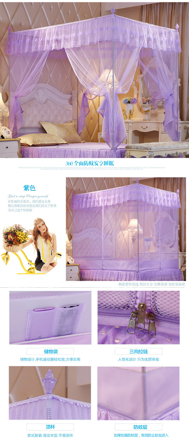 MR坐床拉链三开门有底蚊帐不锈钢管加粗加厚防摔铁艺钢管1.5m1.8米