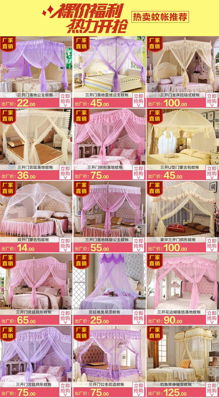 2本公司生产各种蚊帐。蒙古包蚊帐,魔术蚊帐,方顶拉链蚊帐,落地蚊帐,拱形蚊帐,伸缩管蚊帐,轨道蚊帐,吊顶蚊帐,简易蚊帐等等。质量好,款式新,欢迎各位新老顾客前来洽谈订购。