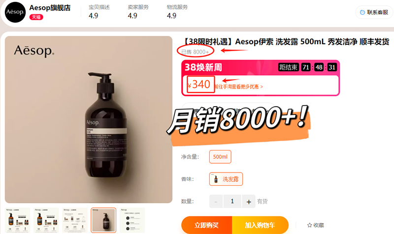 本身人家也是口碑王牌了!月销8000多瓶,累计销量8W+!券后价340块,用过你就不愿意换,小贵,但真的值得~