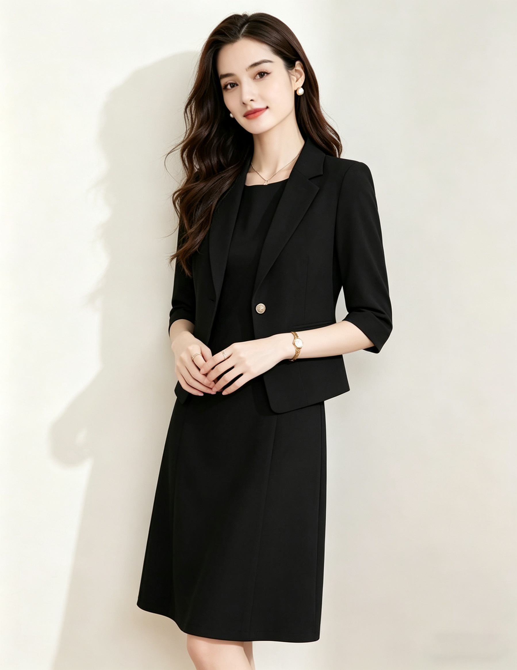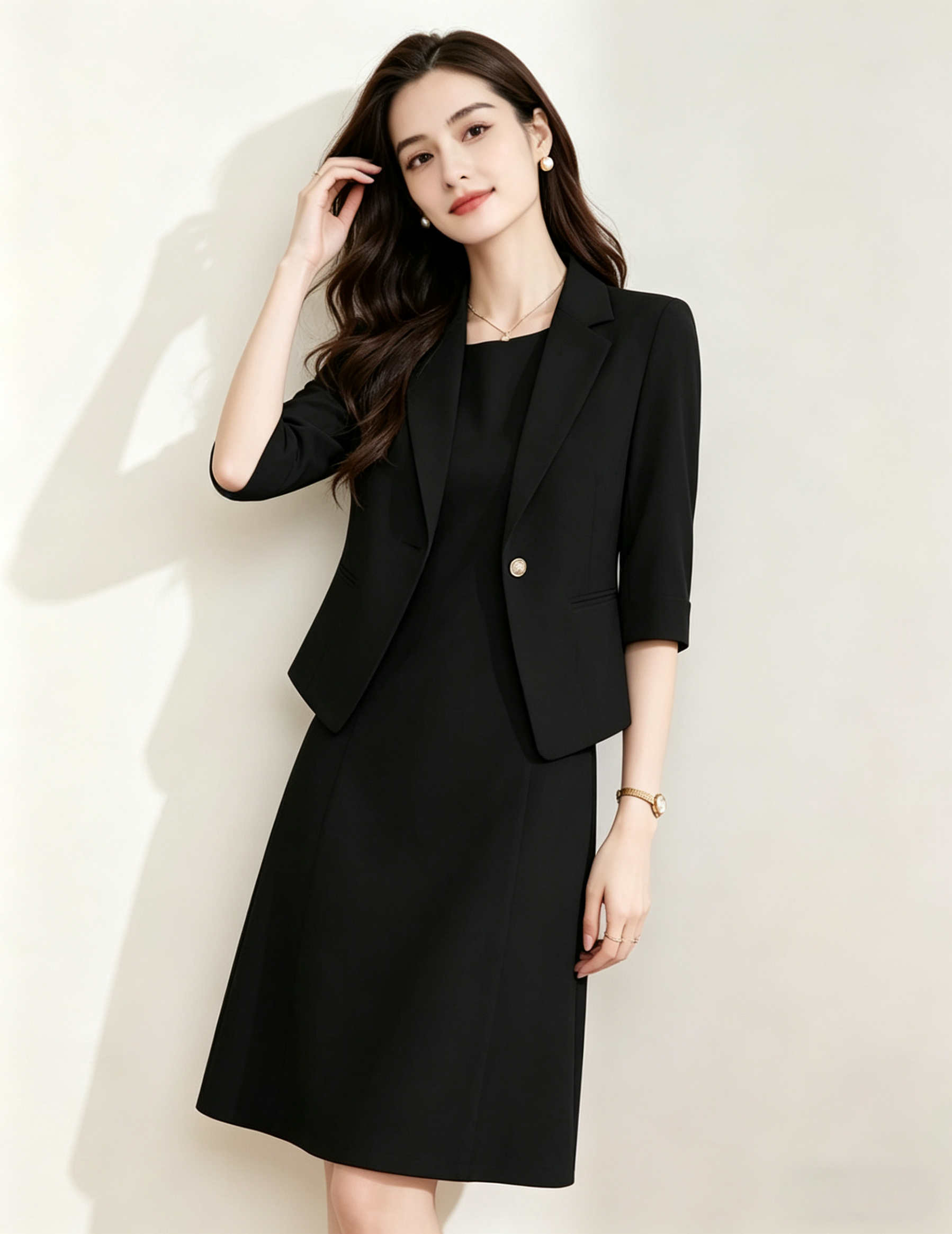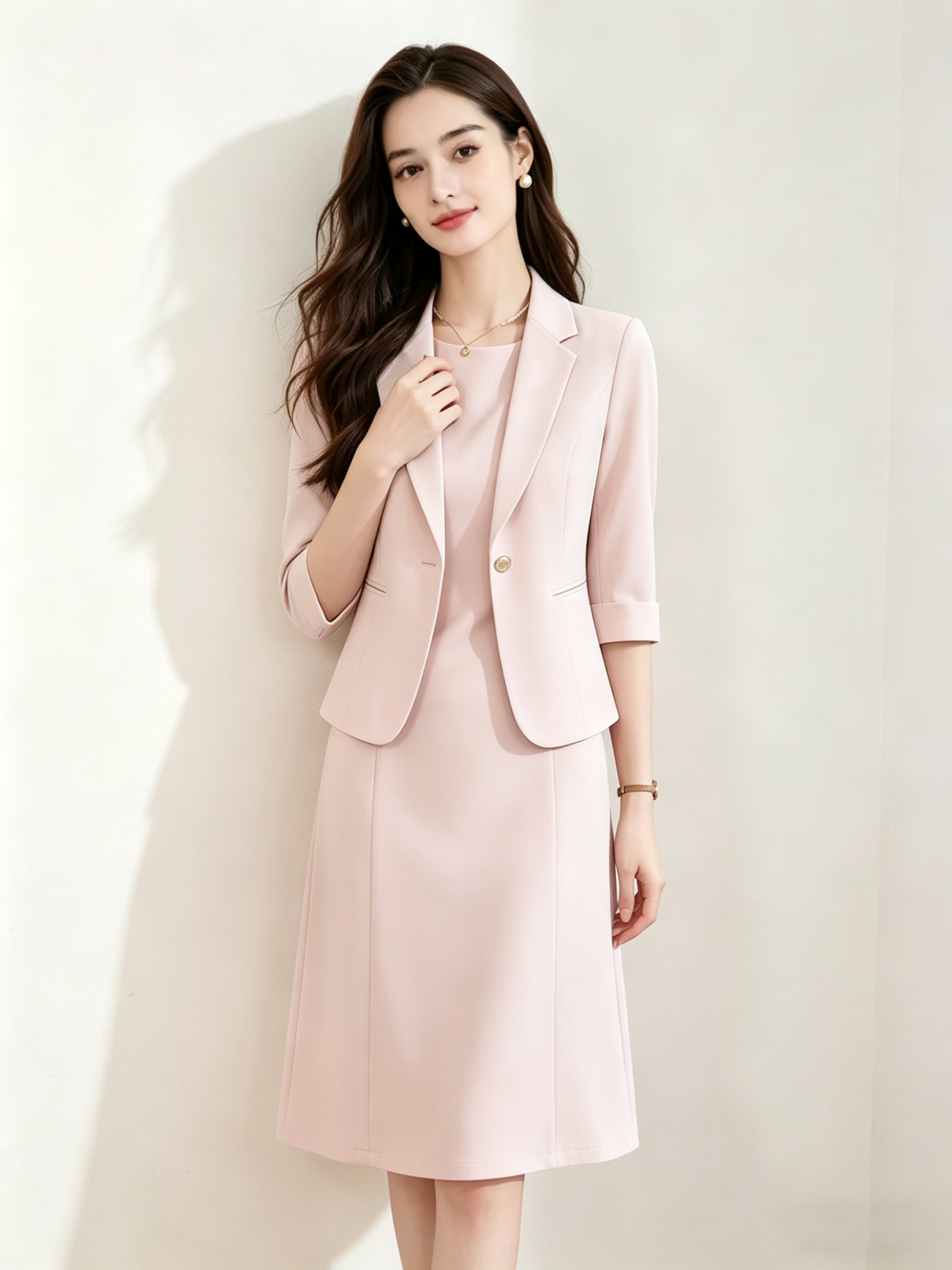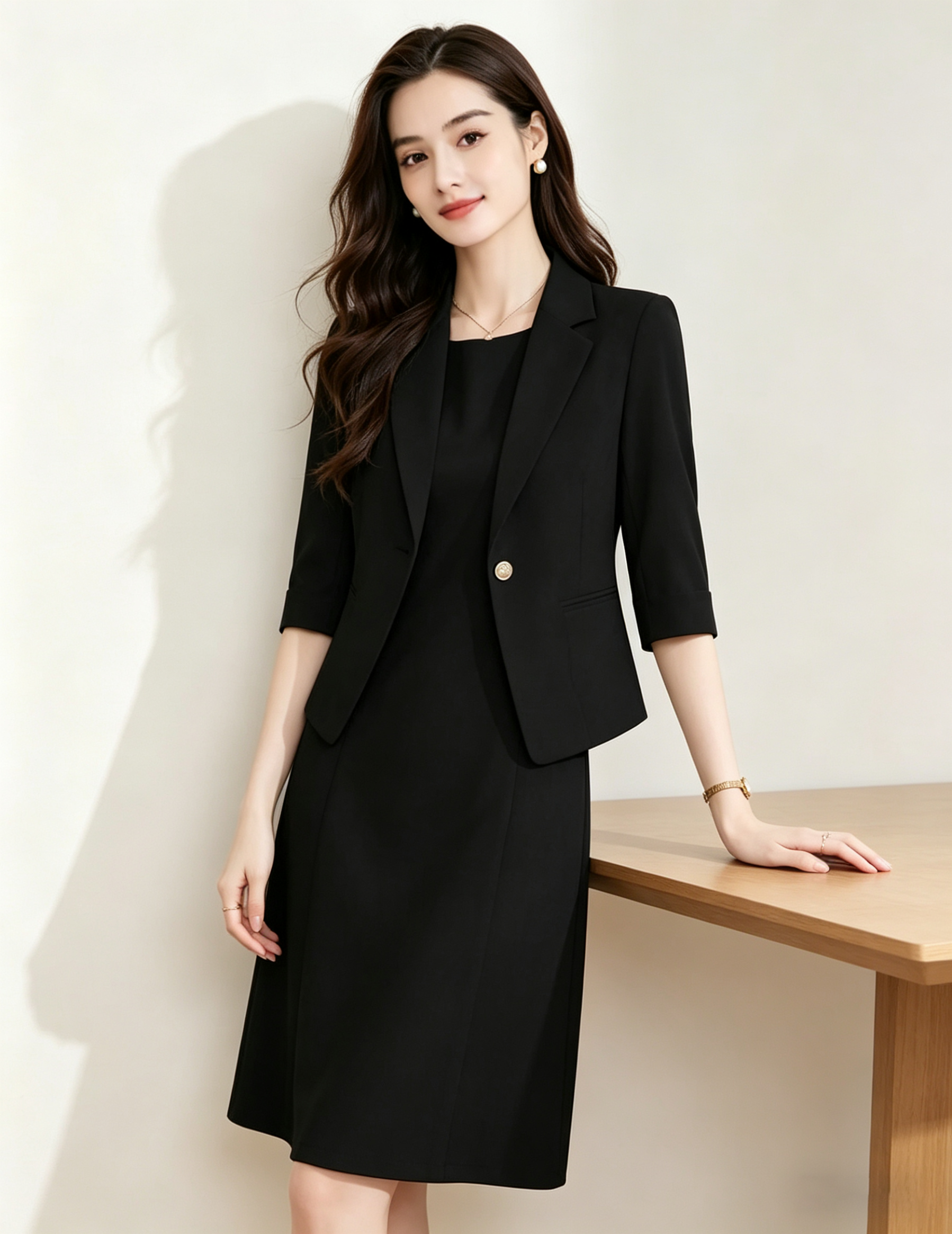 「下单赠送两款胸针」(限时福利)洛诗琳新款通勤七分袖西装外套+无袖直筒连衣裙两件套 99056 (下单7天左右发)