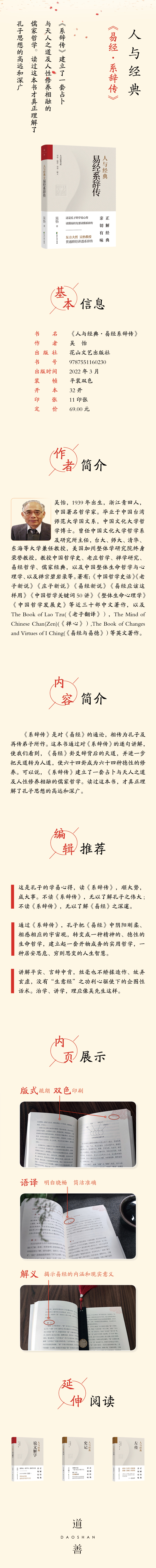 《系辞传》是对《易经》的通论,相传为孔子所作。这本书通过对《系辞传》的逐句讲解,使我们看到,《易经》卦爻辞背后的天道,并更进一步,把天道转为人道,使六十四卦成为六十四种德性的修养。可以说,《系辞传》建立了一套占卜与天人之道及人性修养相融的《易经》的儒家哲学。读过这本书,才真正理解了孔子思想的高远和深广。