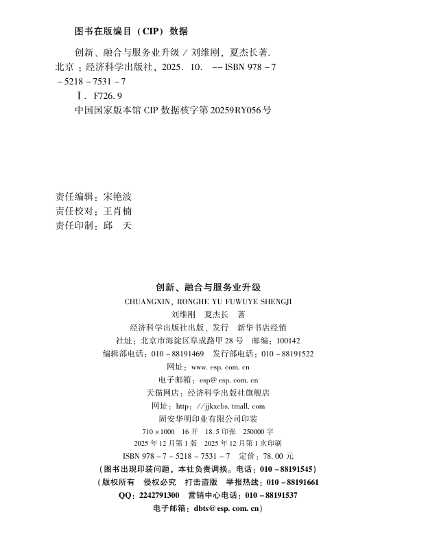 本书是国家自然科学基金面上项目的研究成果,是对创新、融合与服务业升级主题较为系统的研究, 由刘维刚副教授(广州商学院经济学院)和夏杰长教授(广州商学院经济学院、 中国社会科学院财经战略研究院)合作完成。刘维刚副教授执笔第一章至第四章; 夏杰长教授执笔第五章至第八章。未来,我们将会继续深入这一主题,结合人工智能等新技术特征, 紧密联系国家在创新驱动、两业融合与服务业发展方面的政策,力争推出更高水平的学术著作, 为构建中国经济学自主知识体系作出应有的贡献。