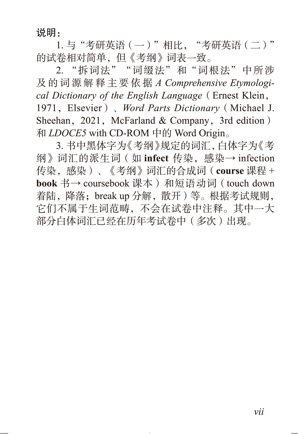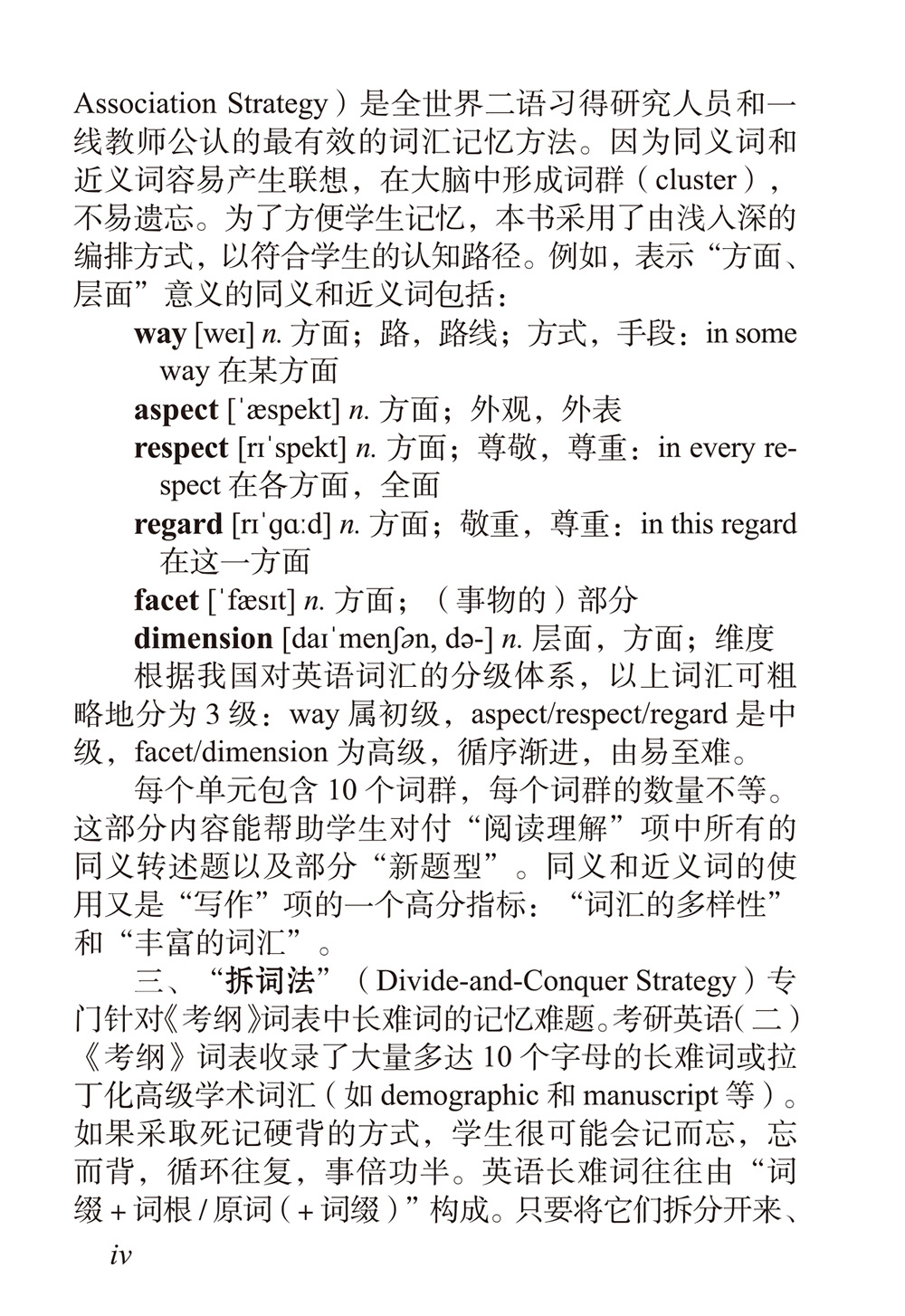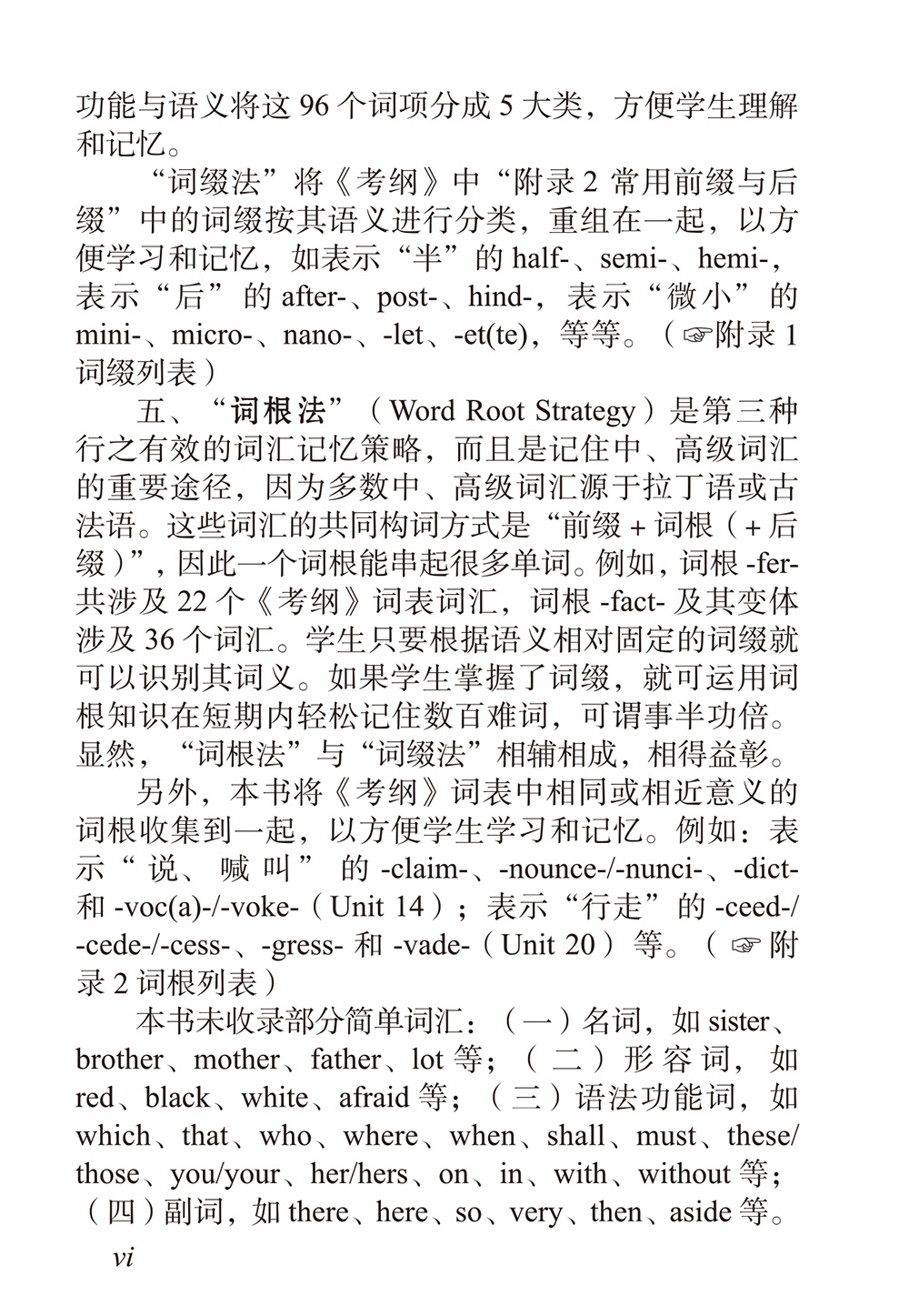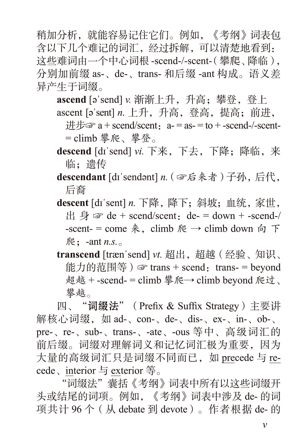 四、词缀法。此部分主要讲解核心词缀,如ad-,con-,de-,dis-,ex-,in-,ob-,pre-,re-,sub-,trans-,-ate和-ous等中高级词汇的前后缀。词缀对理解词义和记忆词汇极为重要,因为大量的高级词汇只是词缀不同而已,如prescribe与subscribe、internal与external等。