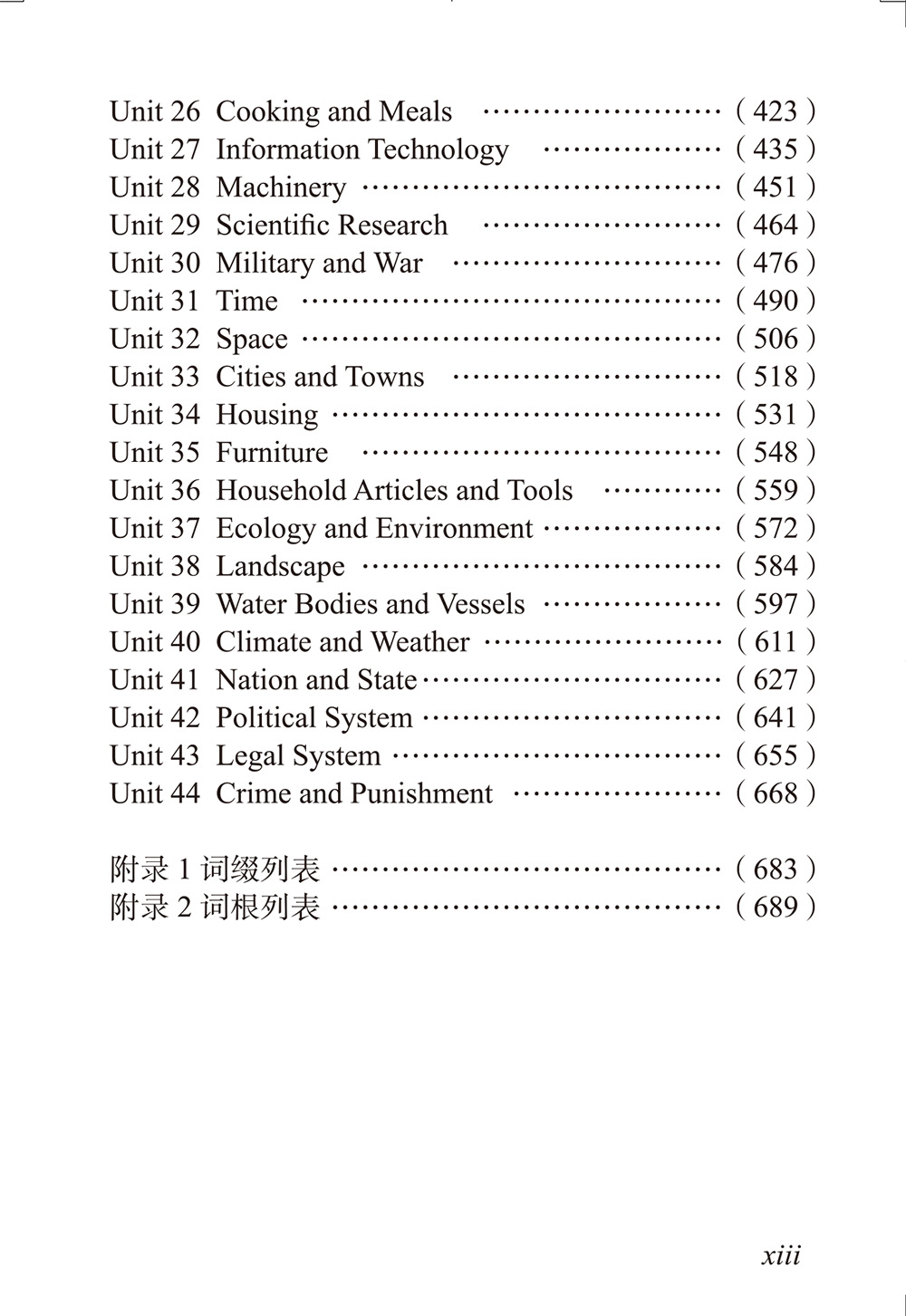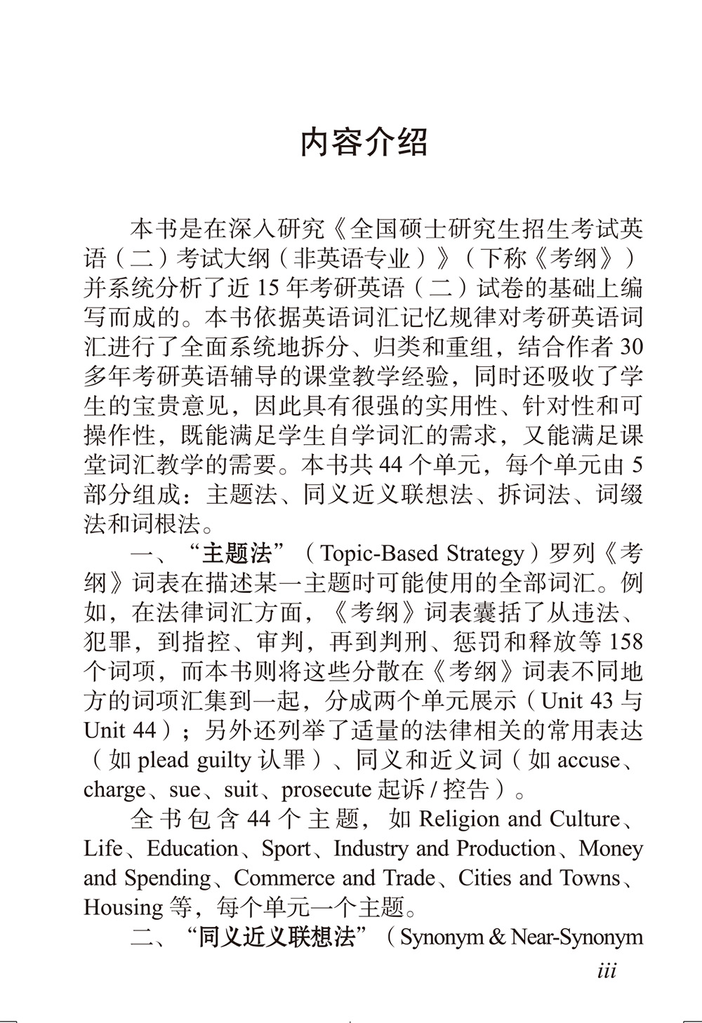 一、主题法。此部分罗列《大纲》词表在描述某一主题时可能会使用的全部词汇。例如,在法律词汇方面,《大纲》词表囊括了从违法、犯罪,到指控、审判,再到判刑、惩罚和释放等158个词项,而本书则将分散在《大纲》词表不同地方的这些词汇集中到一起,分成两个单元展示(Unit 43与Unit 44)。全书包含44个主题,每个单元一个主题。