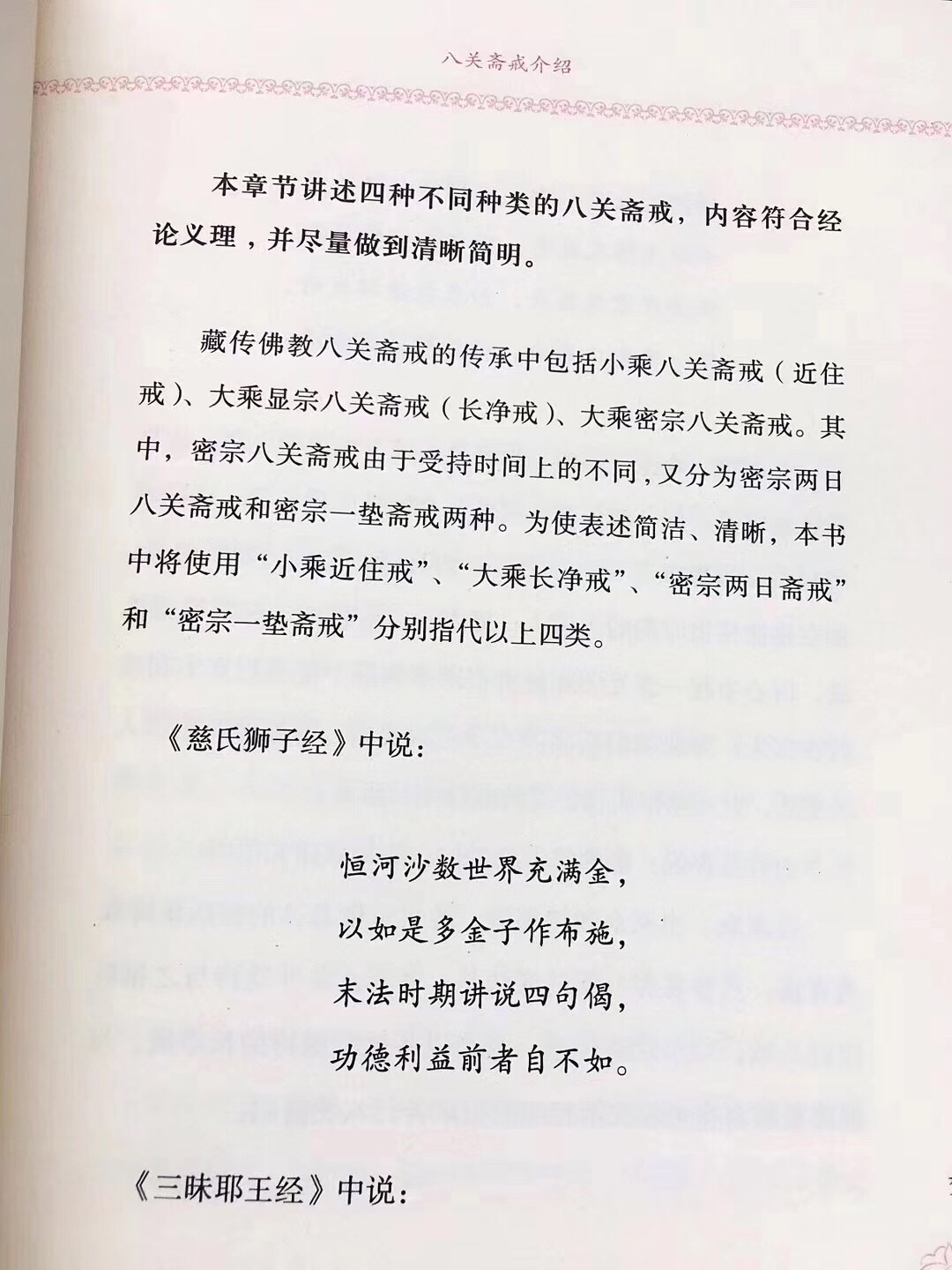 藏传佛教八关斋戒(修订版) 》堪布.班玛香曲 青海民族出版社 藏传佛教八关斋戒的传承中包括小乘八关斋戒(近住戒)大乘显宗八关斋戒(长净戒)大乘密宗八关斋戒。