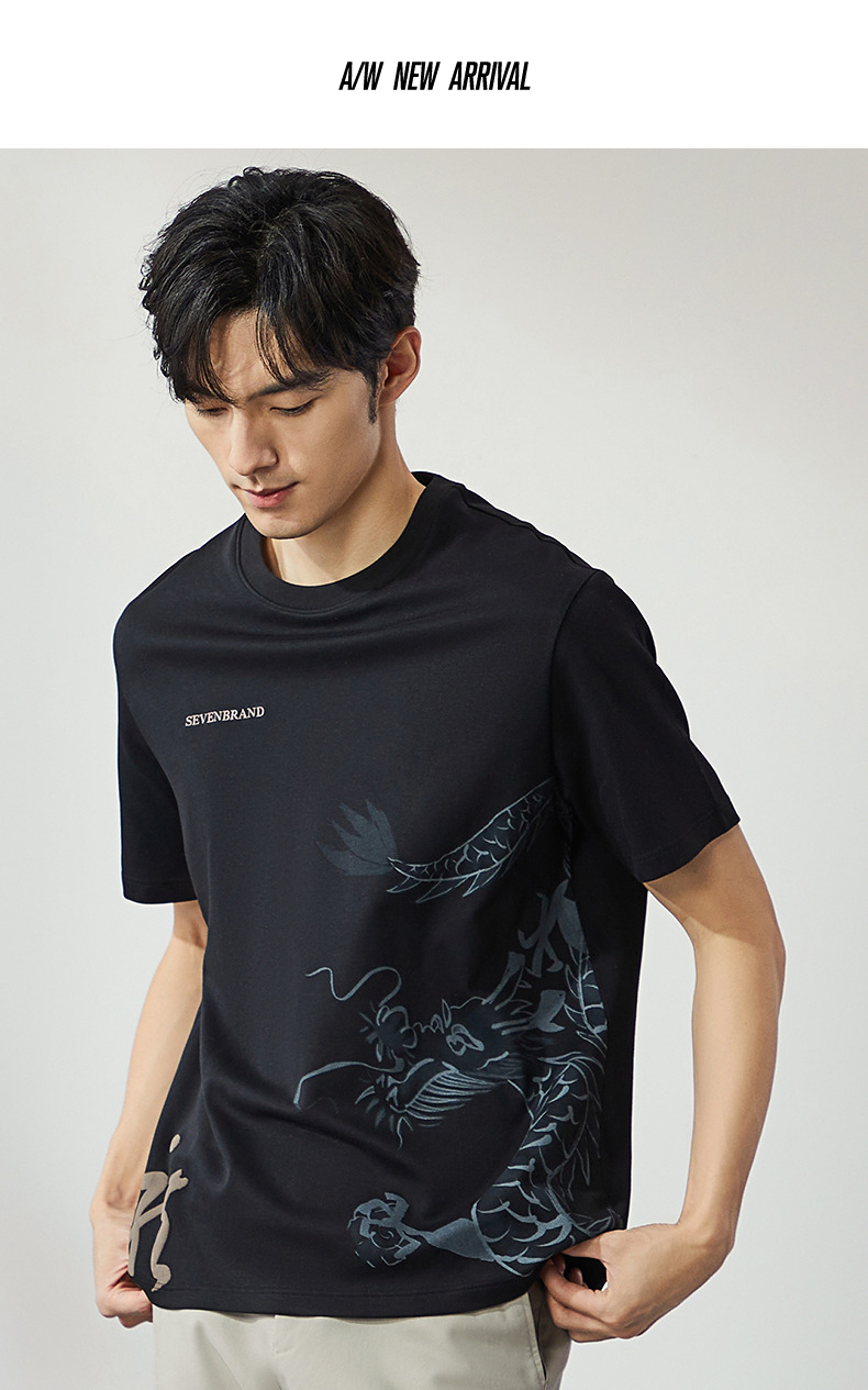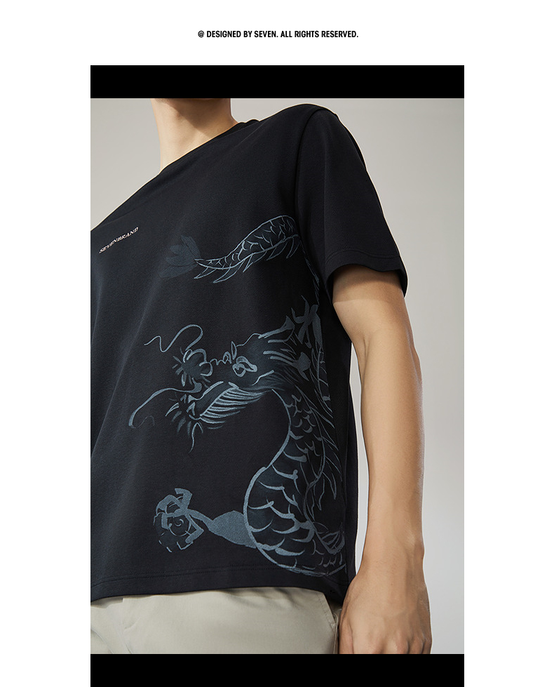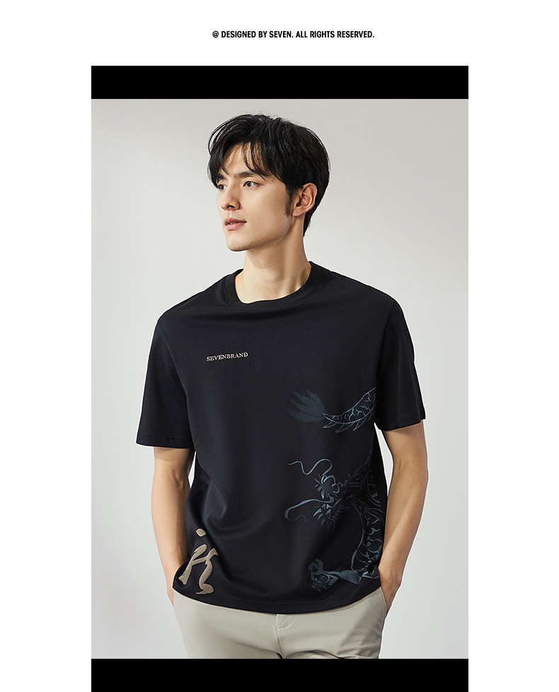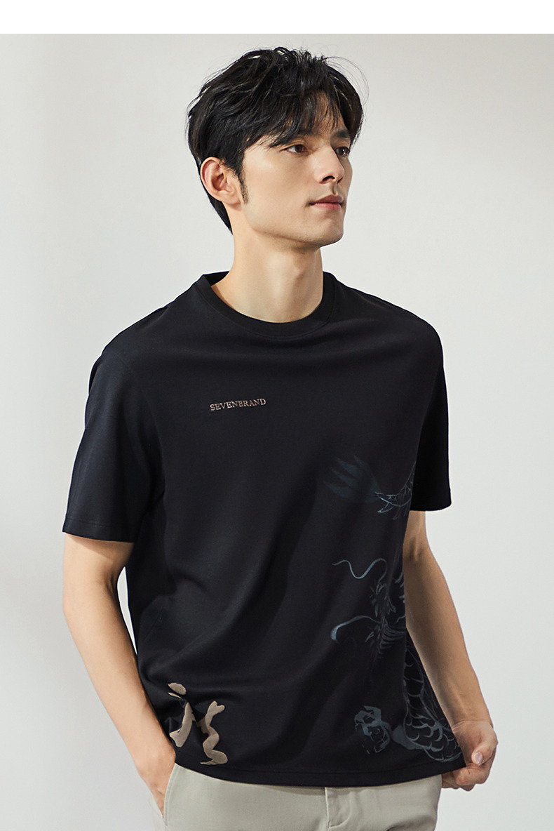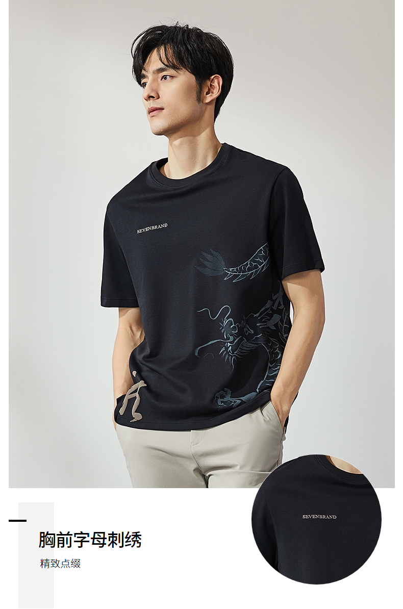 柒牌短袖T恤男2025夏季新款时尚青年休闲百搭黑色龙纹圆领薄上衣 128T71610