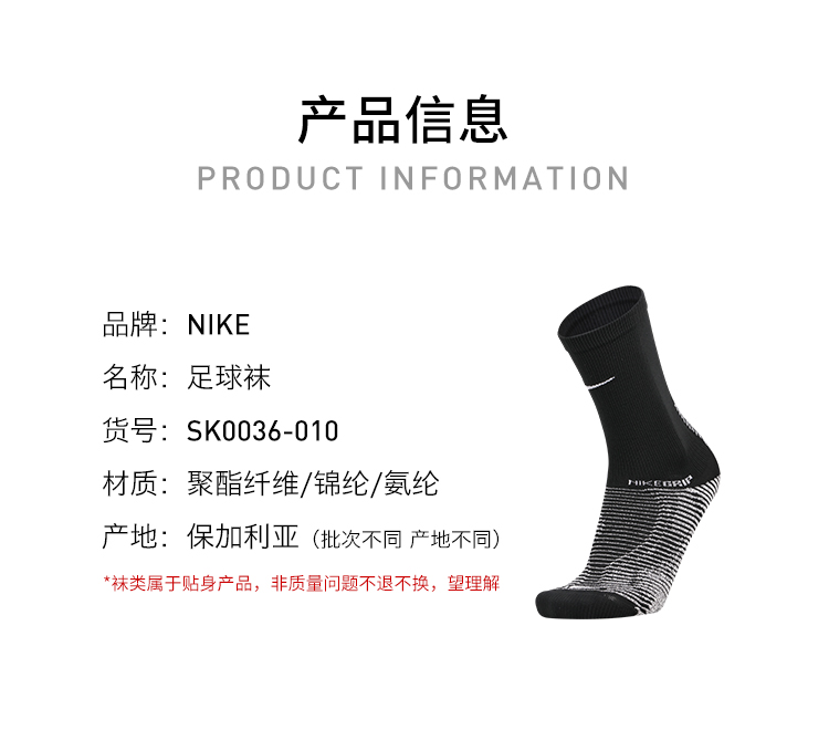 Nike/耐克Grip球员版足球训练比赛中筒足球袜男SK0036010