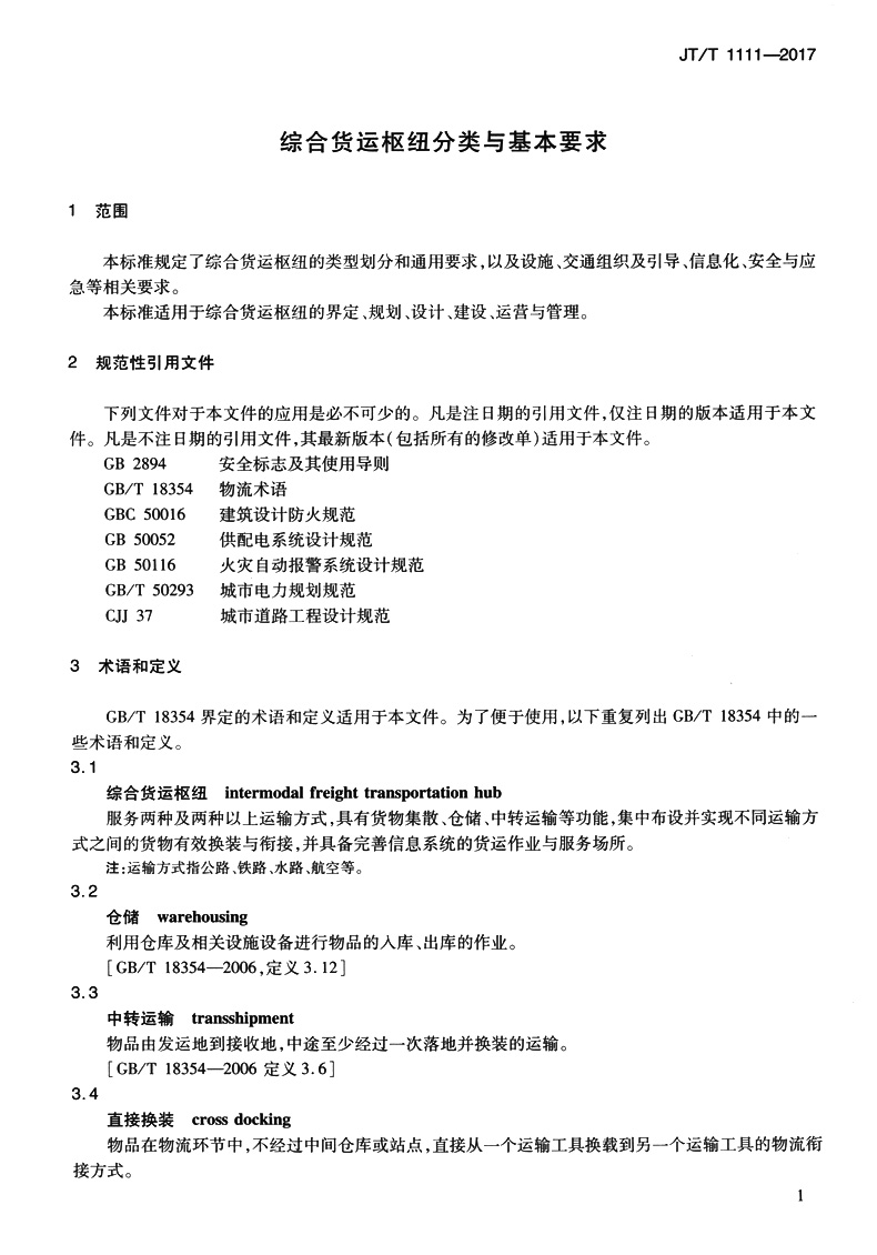 书名:综合货运枢纽分类与基本要求(JT/T 1111—2017)