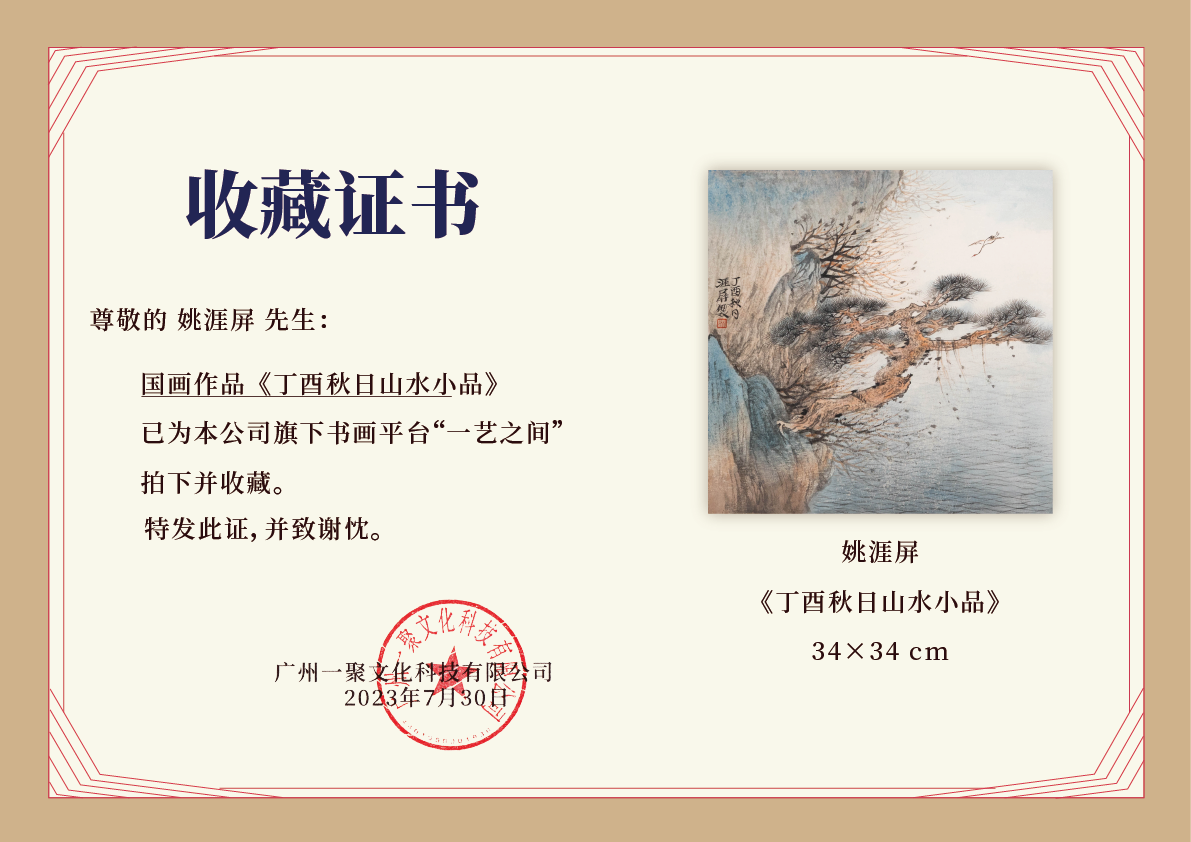 姚涯屏《丁酉秋日山水小品》国画34CM×34CM 约1平尺手绘纸本宣纸作品【原作编号GH0401】