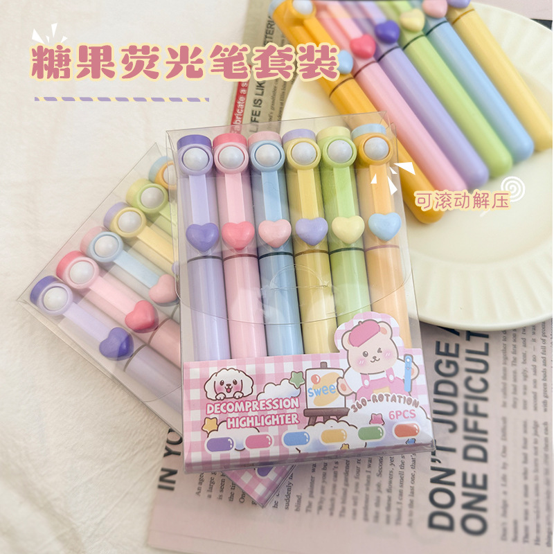 【糖果荧光笔套装!可滚动解压】开学季创意解压滚滚荧光笔学生专用划重点记笔记高颜值手帐笔。ra