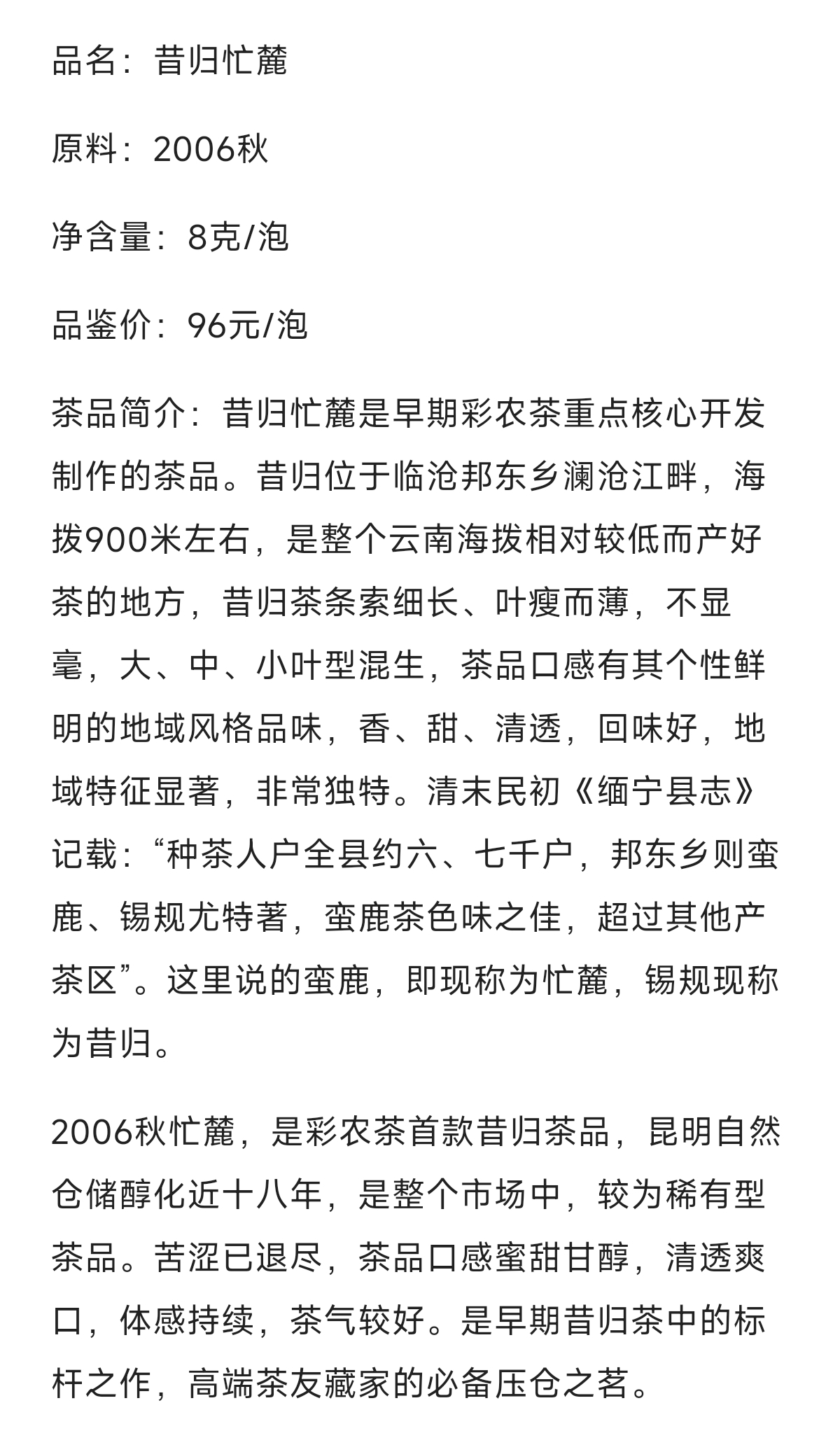 彩农茶·清客普洱丨2006秋昔归忙麓(8克)