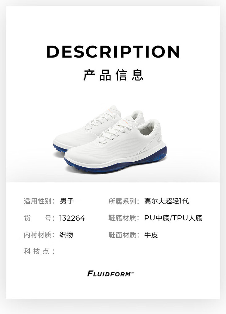 【海外购】【高尔夫LT1超轻1代】ECCO男子高尔夫鞋轻盈回弹新发泡科技132264-01038 25新款