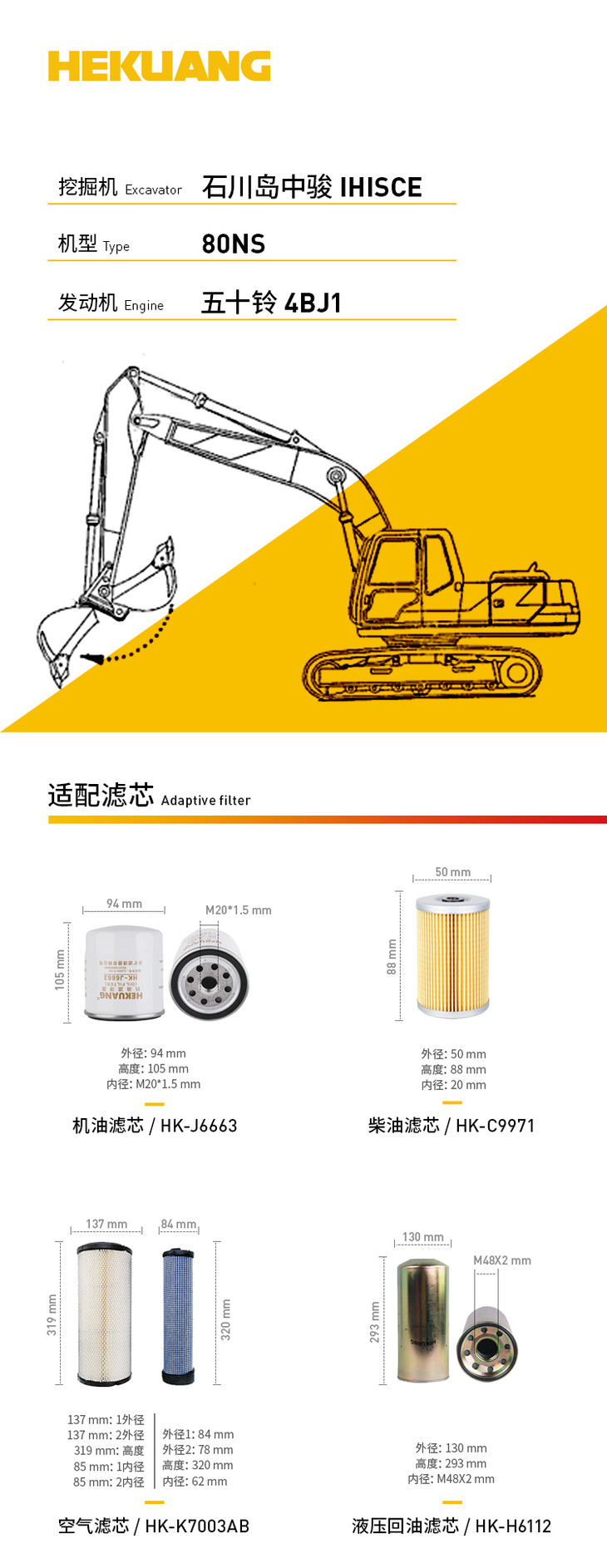 石川岛中骏80NS(五十铃4BJ1)挖掘机滤芯 机油柴油空气滤芯 液压油吸油回油滤芯