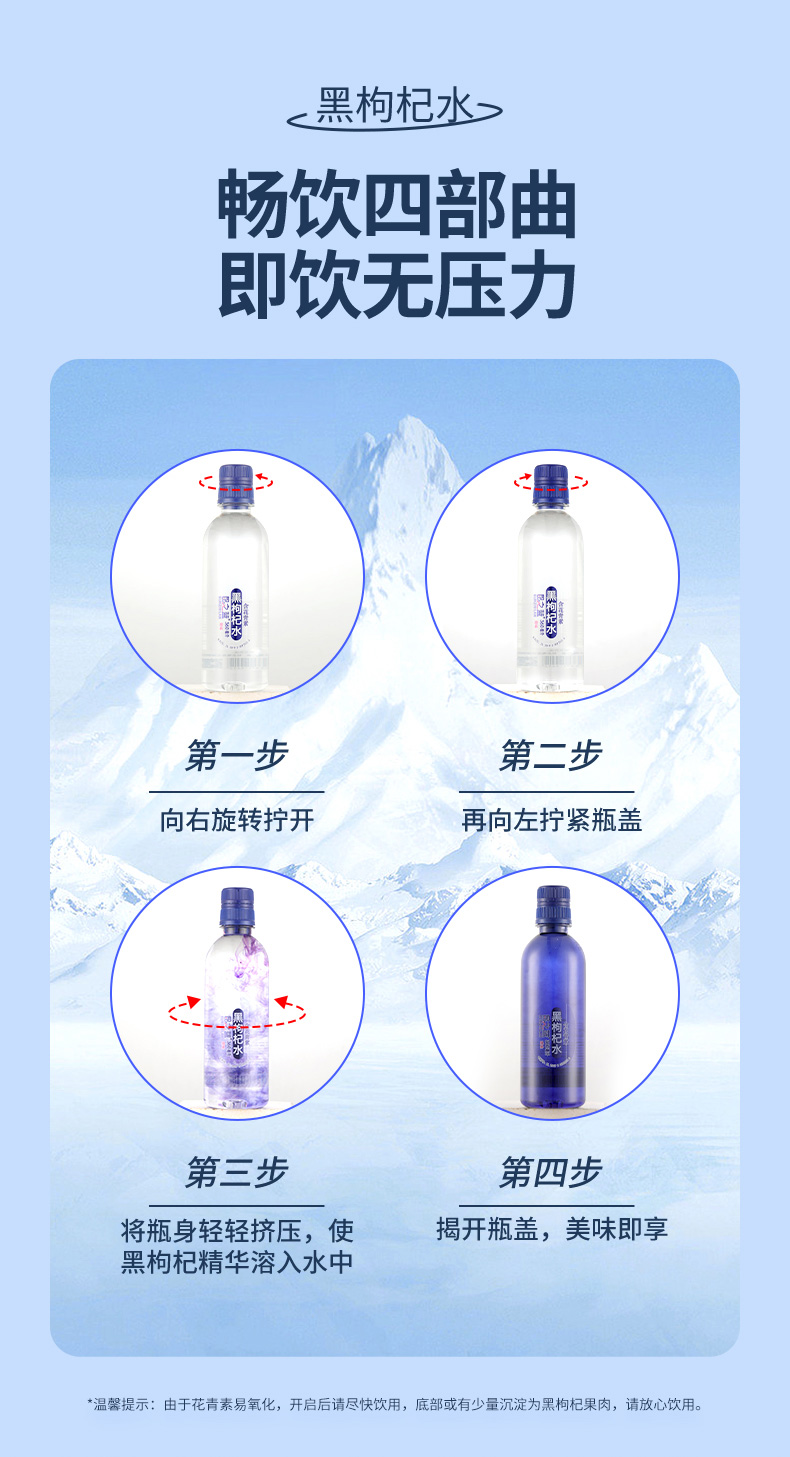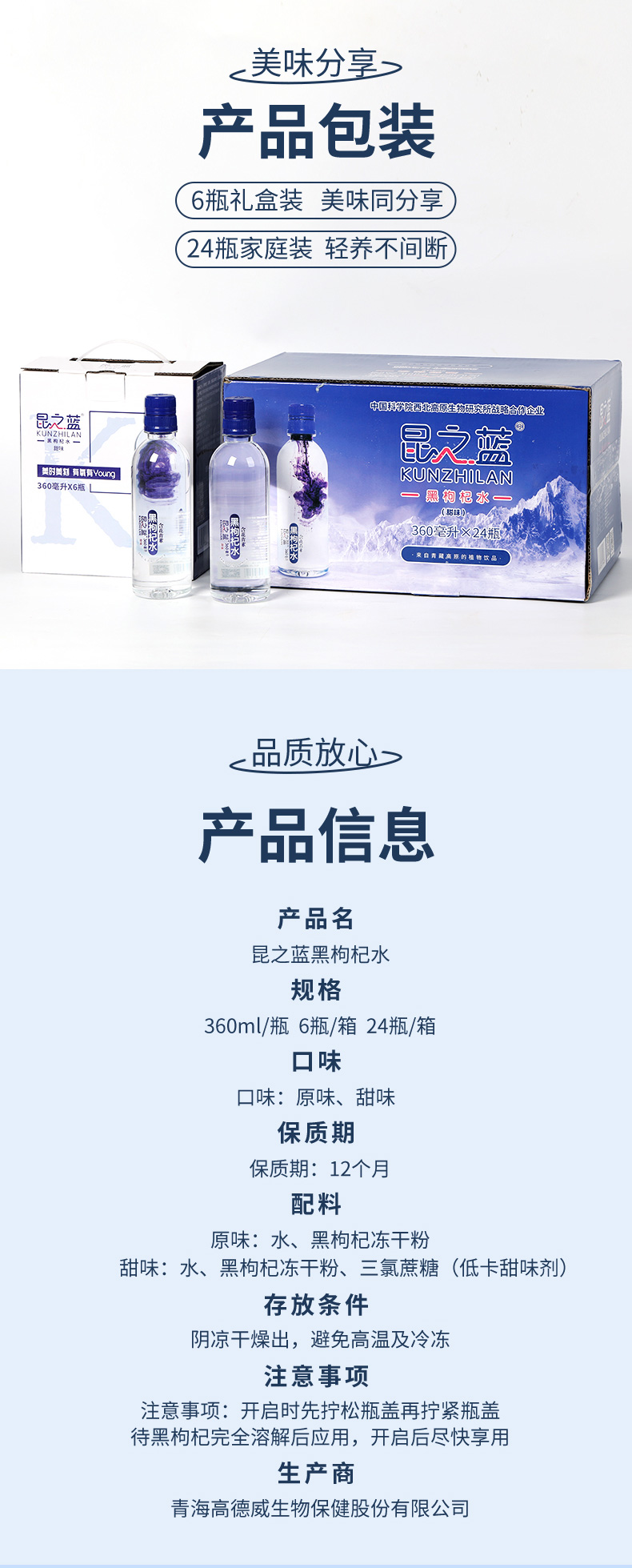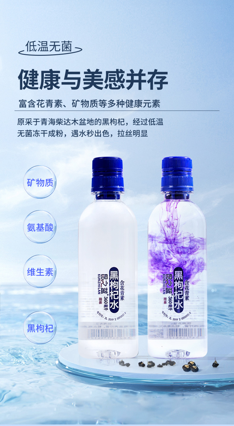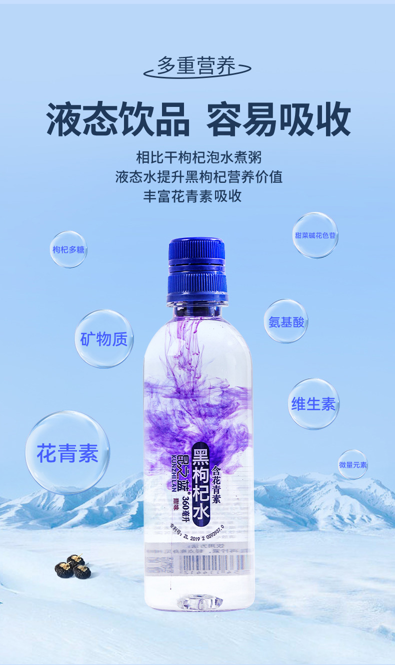 昆之蓝黑枸杞水含花青素饮品高端饮用水弱碱性高原特产360ml/瓶装
