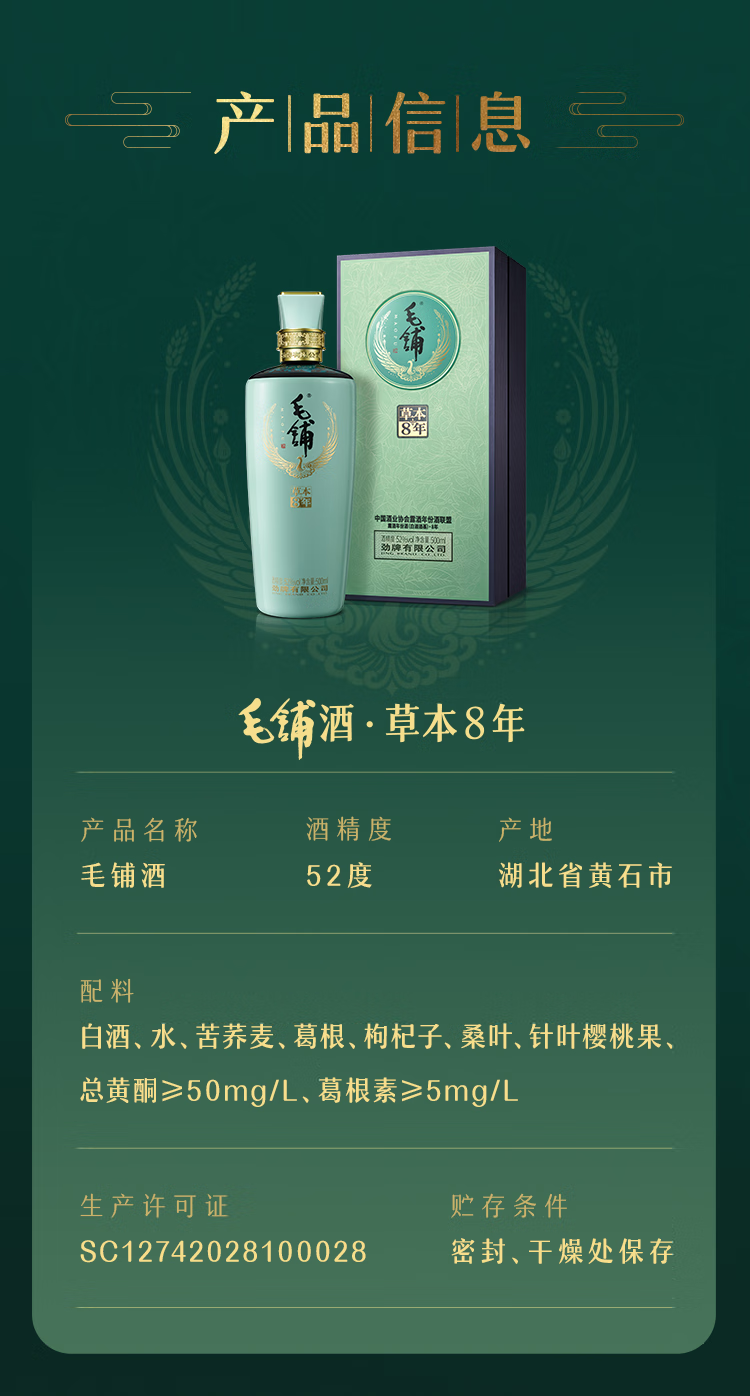 劲牌劲酒 52度毛铺草本年份酒8年 500ml*6