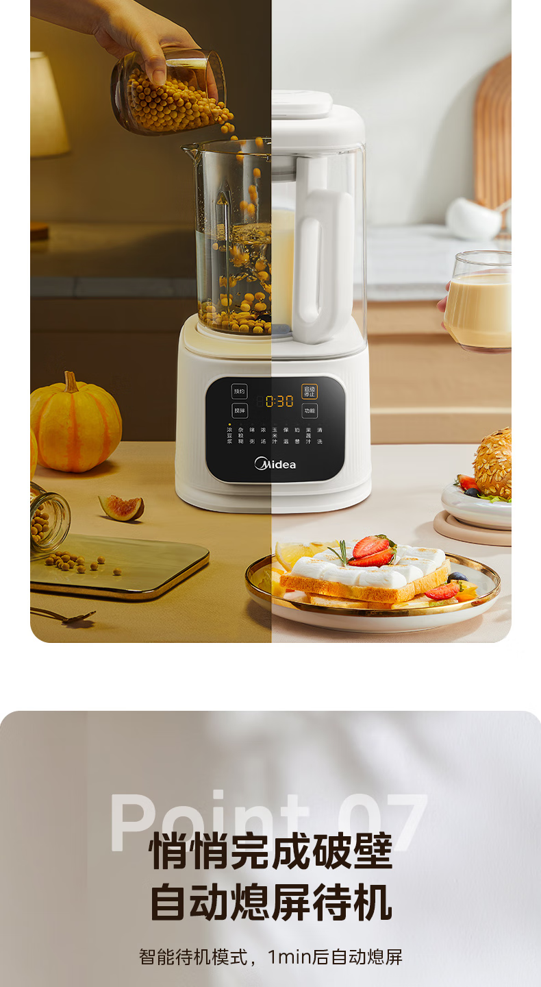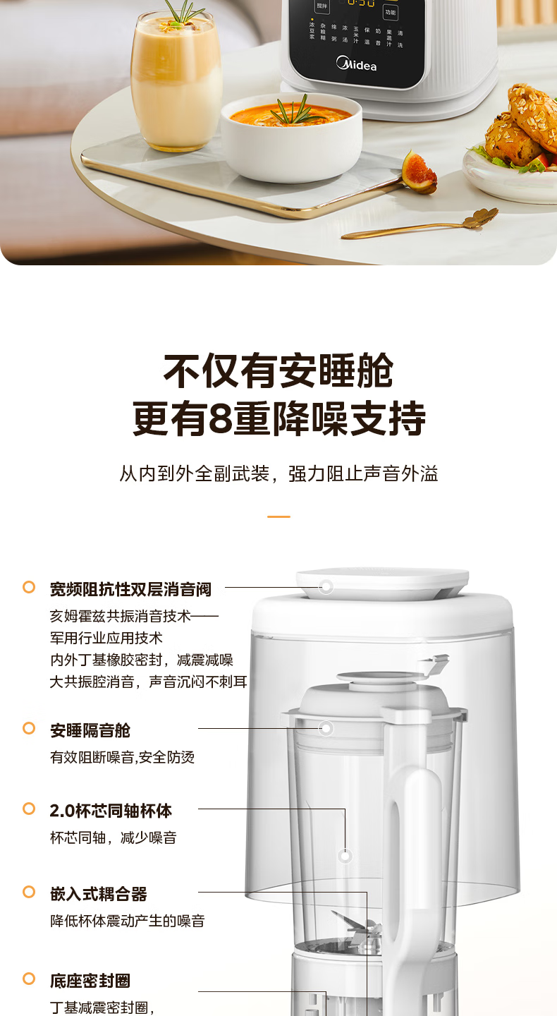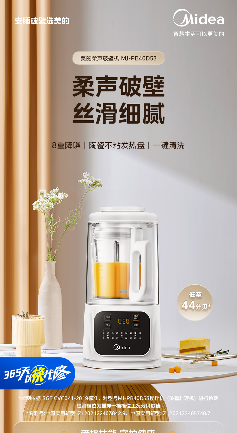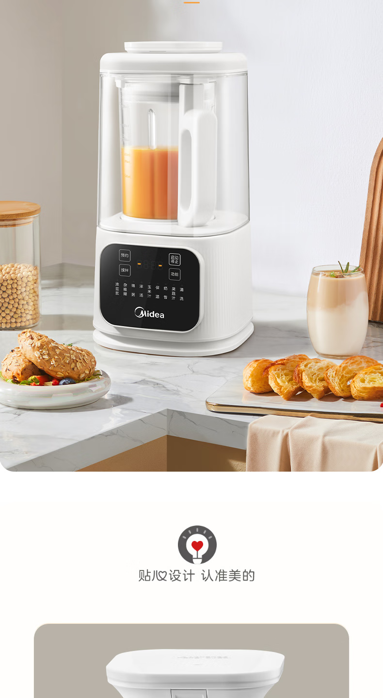 美的(Midea)安睡破壁机家用低音隔音罩降噪榨汁机婴儿辅食机智能预约豆浆机 MJ-PB40D53