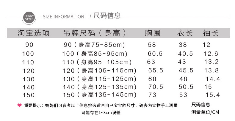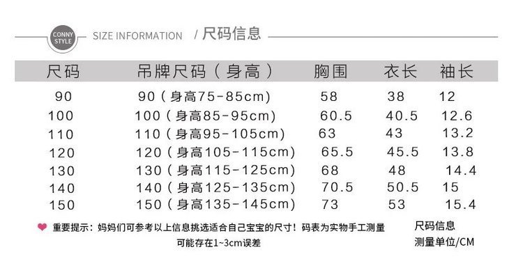 1、衣服尺寸均为手工测量,会有1-3cm误差,属于正常现象,请根据宝宝实际体型选择。