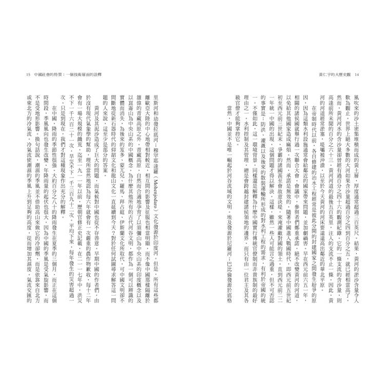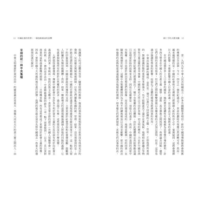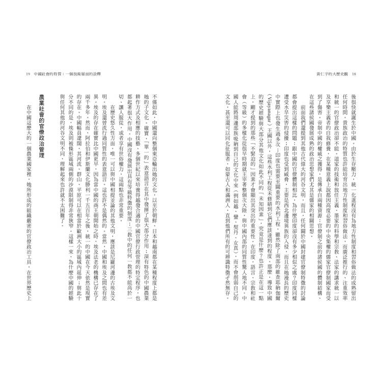 書中探討內容極為廣泛,涵蓋了從中國社會的特質、明代的財政管理系統,到蔣介石的歷史定位等,充分展現了黃仁宇深厚的歷史底蘊和獨到見解。他因親身經歷了近現代中國的苦難,決意投身歷史研究,探究歷史的因果。唯有釐清這些因果,才能為近現代中國尋求一個可能的解方。