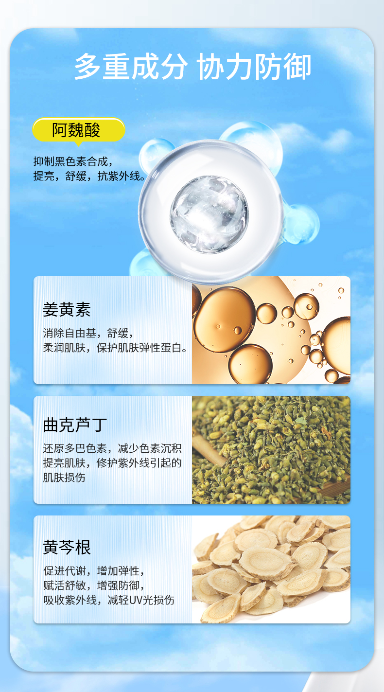 功效:持久防晒黑、晒伤、晒老、防紫外线 、防蓝光、抑制黑色素合成、提亮等