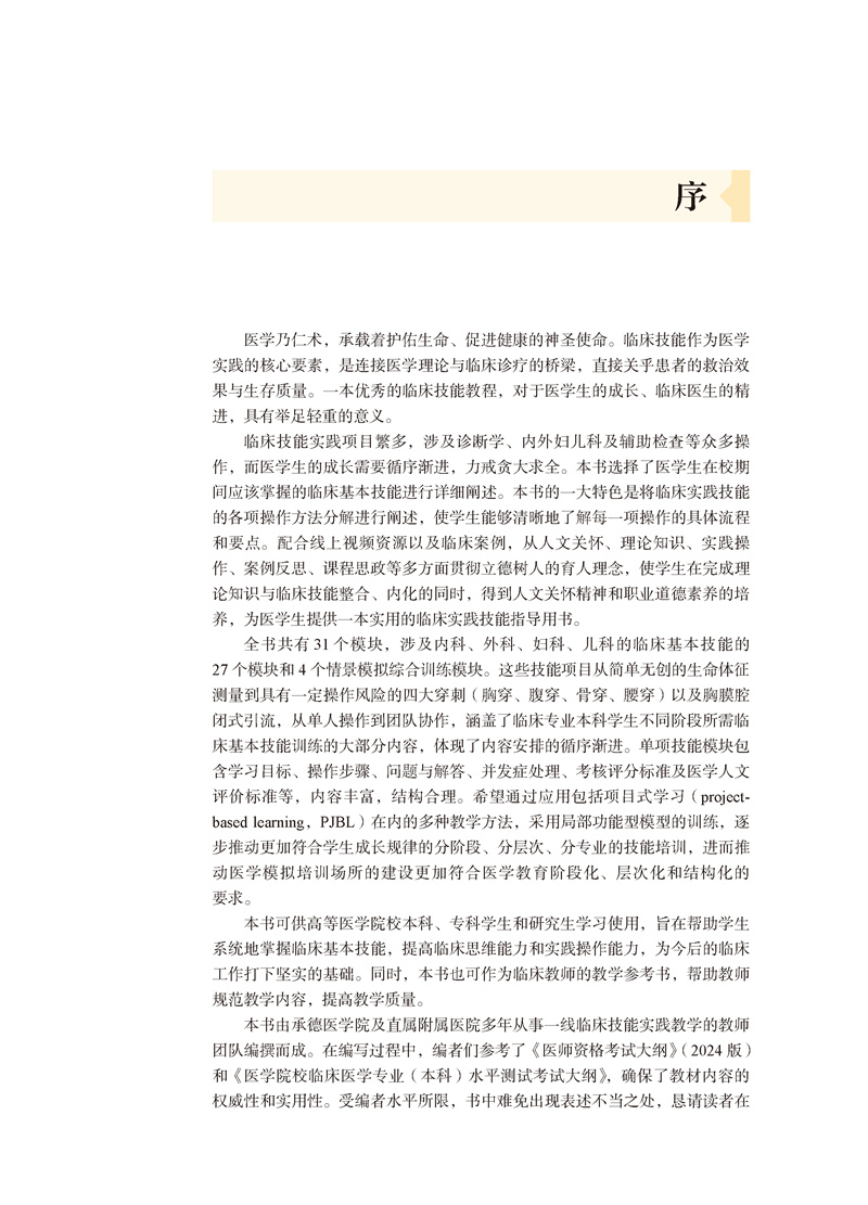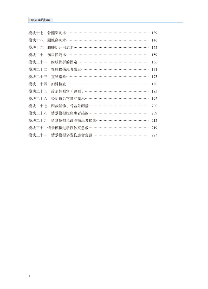 本教材以模块的形式按照分阶段临床技能培训的教学方式进行内容安排,符合医学生成长的规律,具体内容包括:心电图描记、心肺复苏术、注射技术、静脉输液、动脉穿刺、经外周静脉置入中心静脉导管术、胃肠减压、导尿术、穿脱隔离衣、穿脱防护服、环甲膜穿刺、气管插管、创伤急救技术、胸膜腔穿刺术、胸膜腔闭式引流、腹腔穿刺术、骨髓穿刺术、腰椎穿刺术、脓肿切开术、清洁伤口、感染性伤口的换药、四肢骨折的固定、脊柱损伤病人搬运、肛门指诊、妇科检查、诊断性刮宫、经阴道后穹隆穿刺术、四步触诊、骨盆外测量等技术,以及急诊腹痛患者接诊、急诊胸痛患者接诊、过敏性休克急救、多发伤患者急救4个情景模拟。