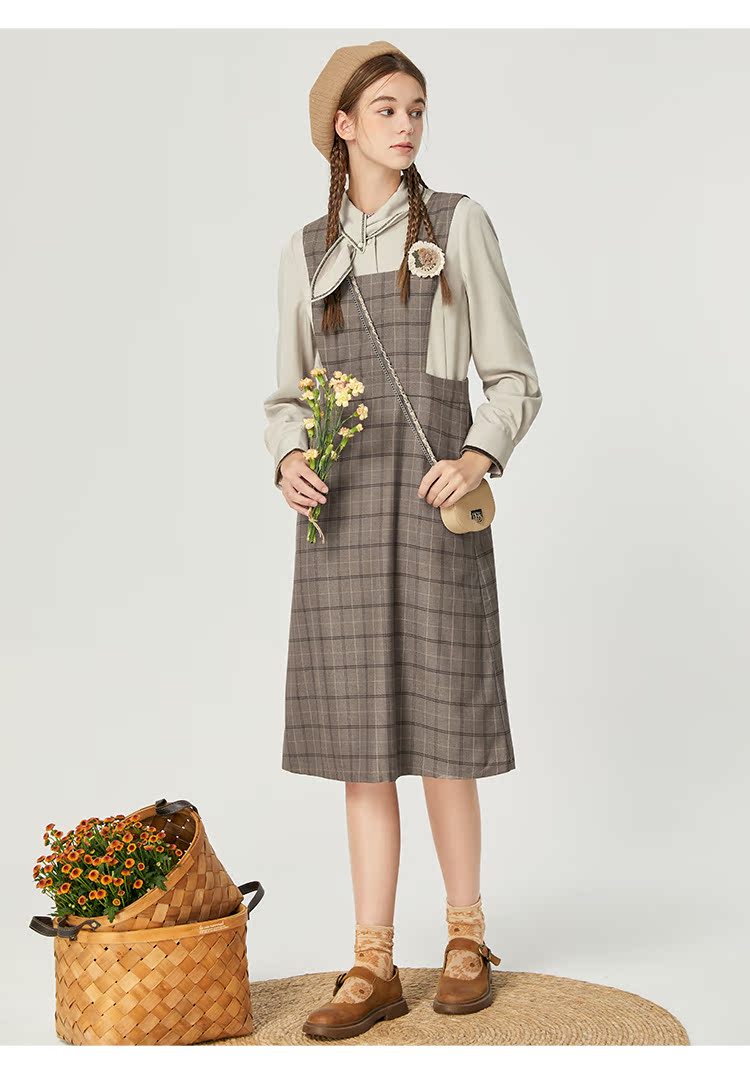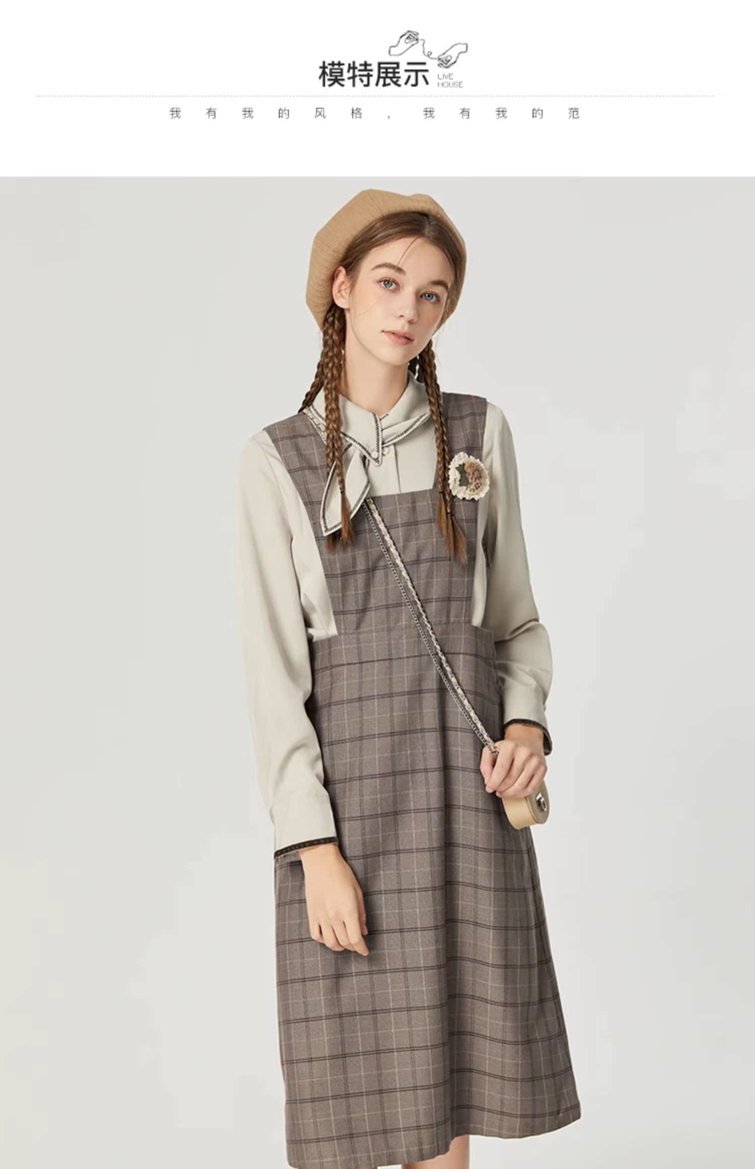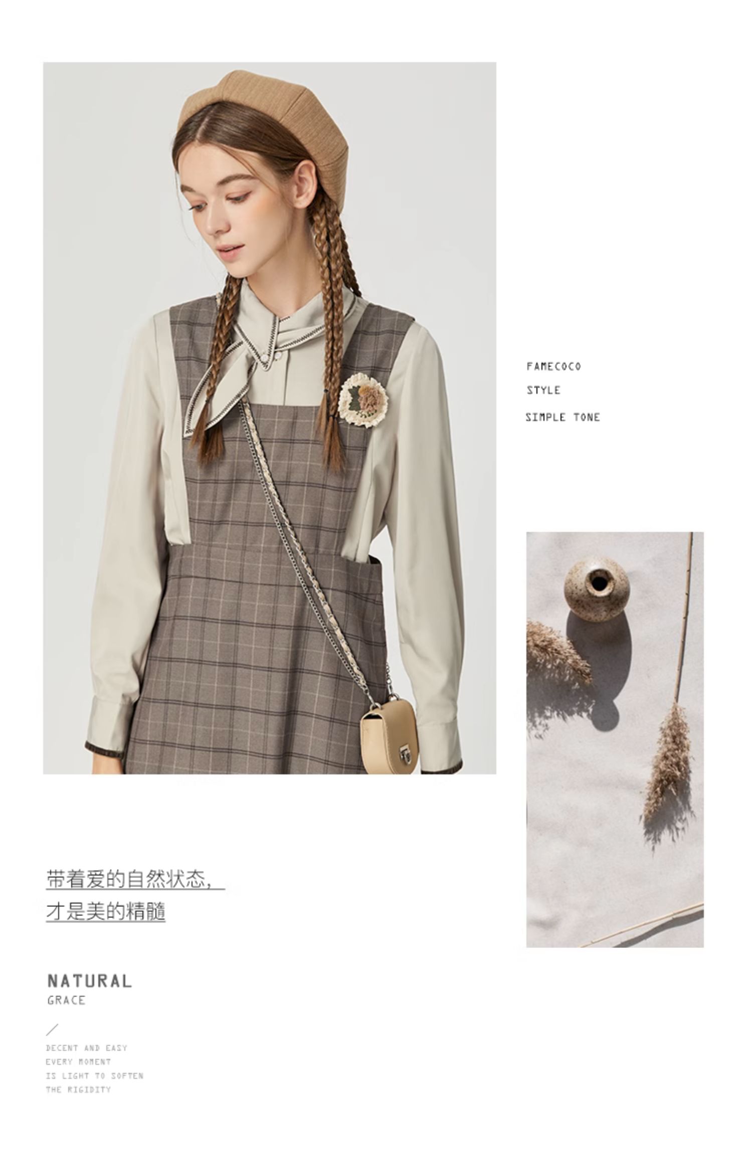 Famecoco范可儿复古连衣裙两件套秋款长袖衬衫格子背带裙套装