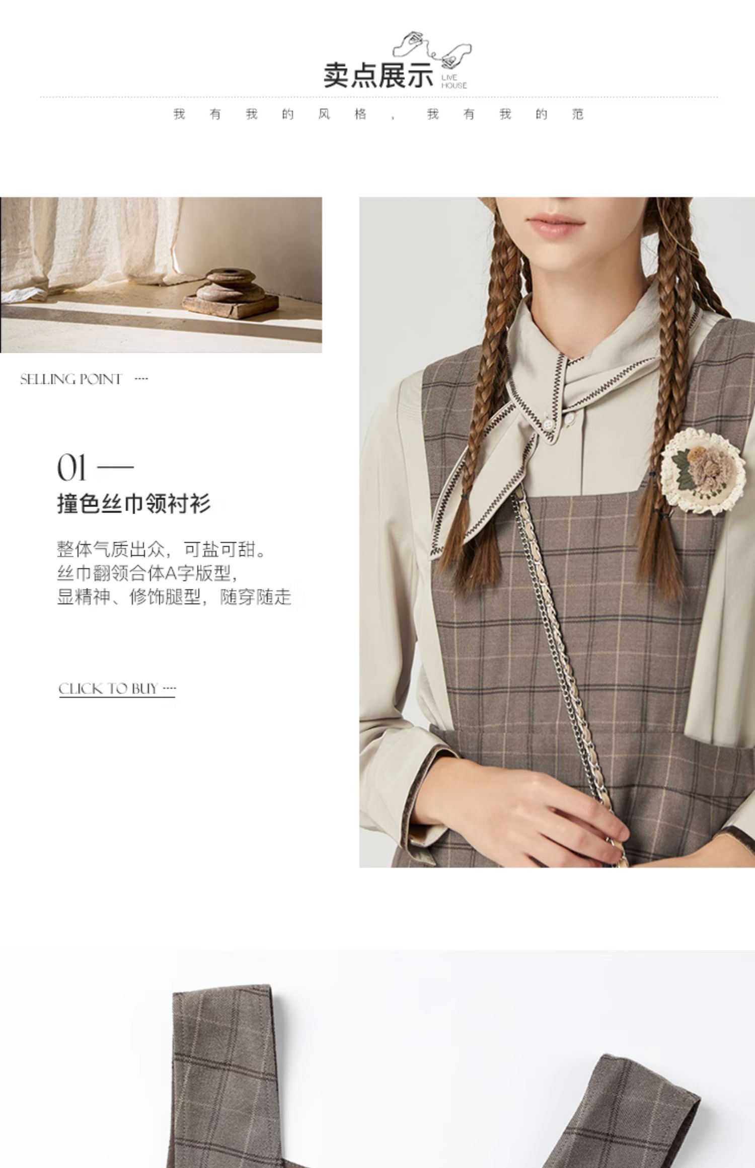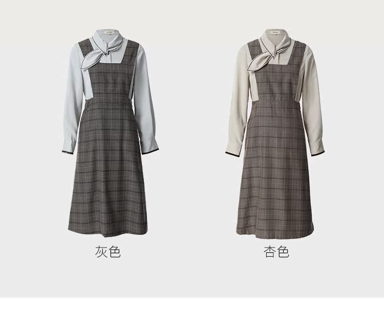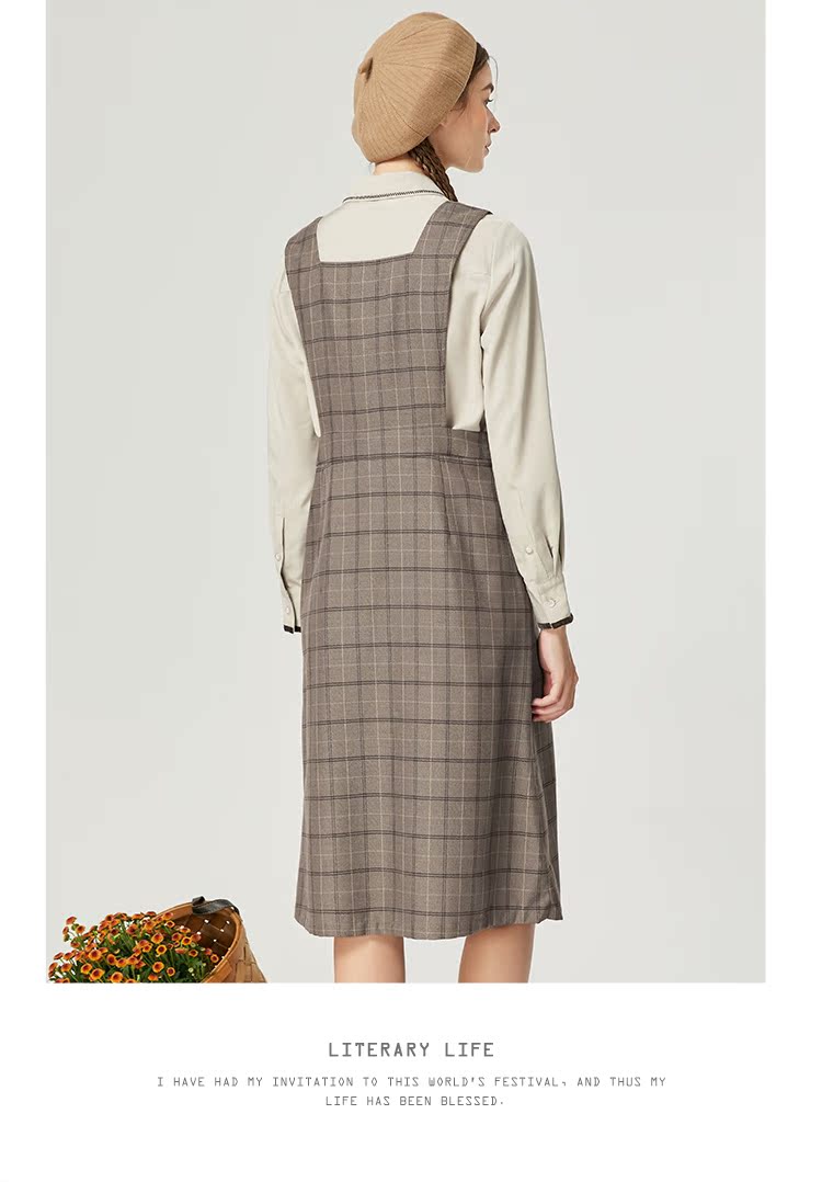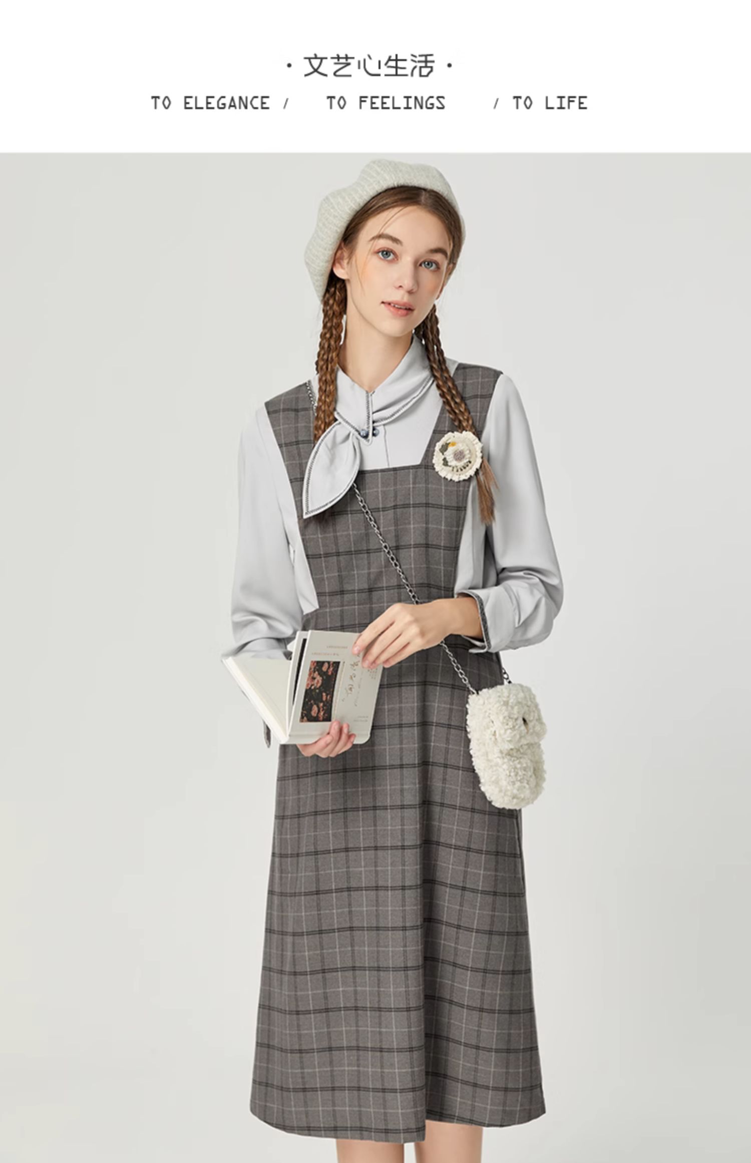 Famecoco范可儿复古连衣裙两件套秋款长袖衬衫格子背带裙套装