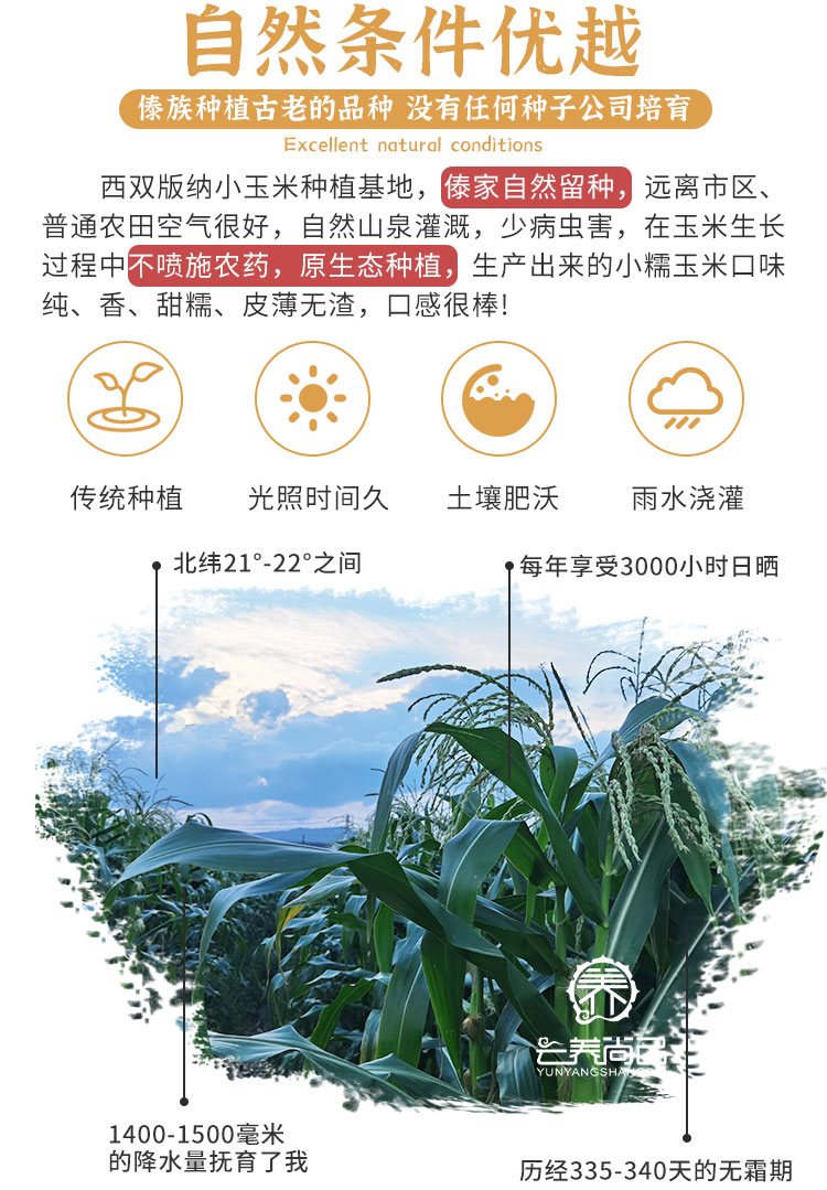 玉米,并非只有西双版纳有,不同地方的玉米口感截然不同,绿野珍珠小玉米却只有西双版纳具有,甜香糯软的口感,吃惯了版纳特有的小玉米,再尝试其它地方的玉米索然无味。