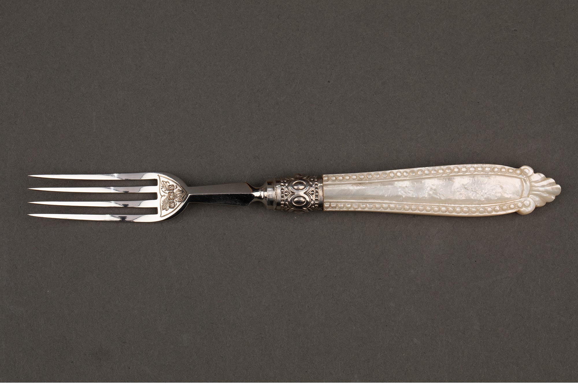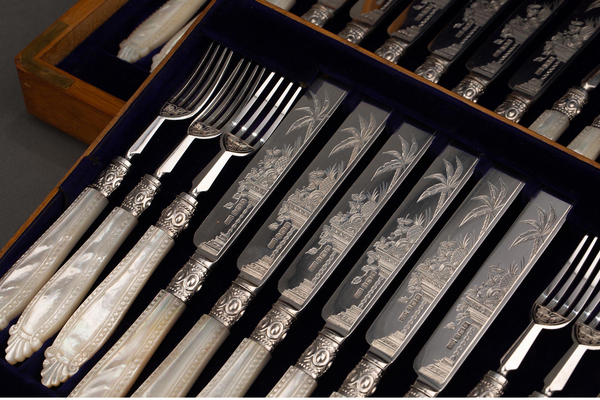 1897年英国银器名坊Harrison Brothers & Howson出品母贝手柄装饰纯银精雕餐具套件 带原盒