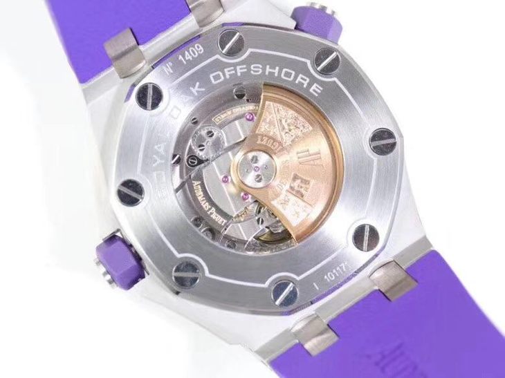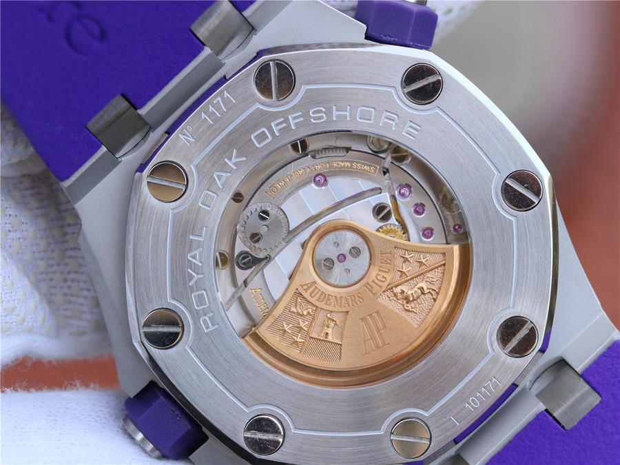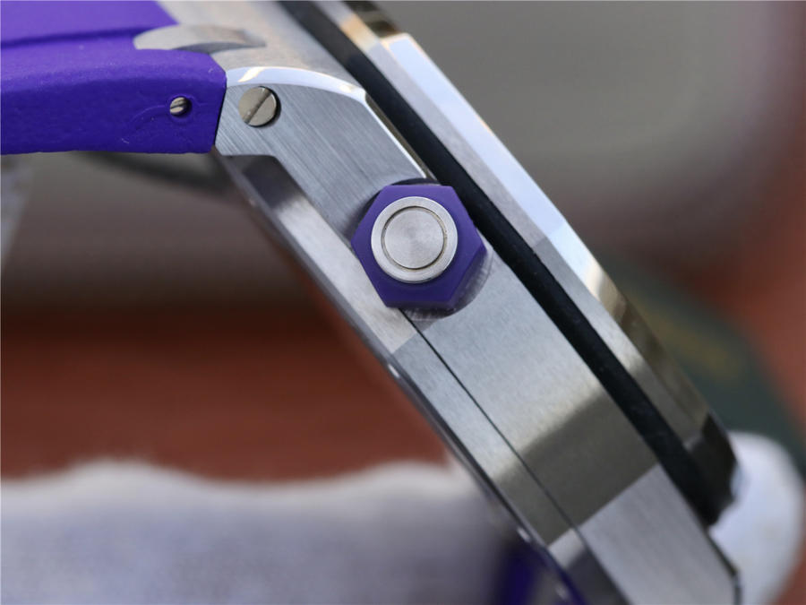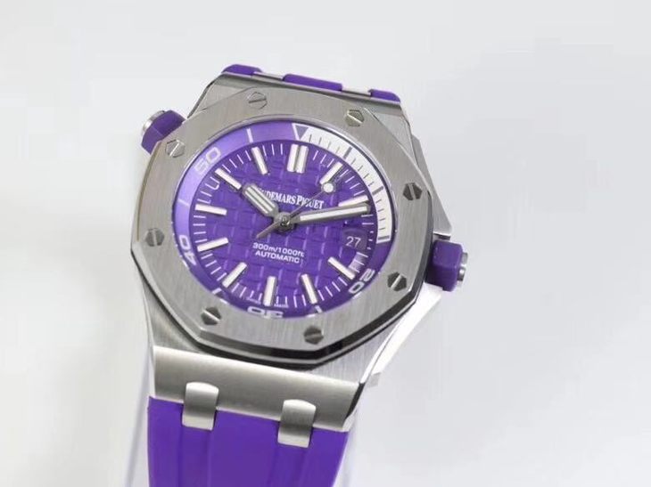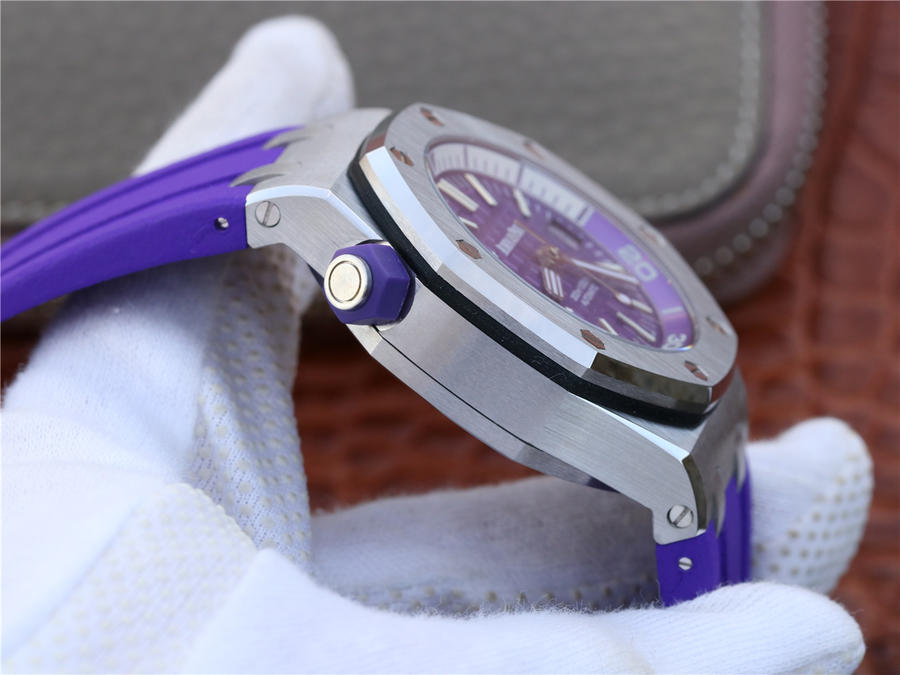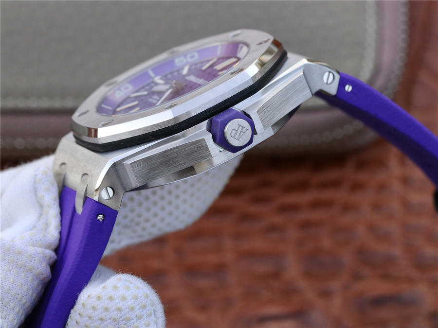 紫色 JF爱彼15710 V9s版,精钢!实测高强度防水200米!进口9015改正品3120机!透底,原装潜水硅胶表带!足够乱真男士手表,自动机械