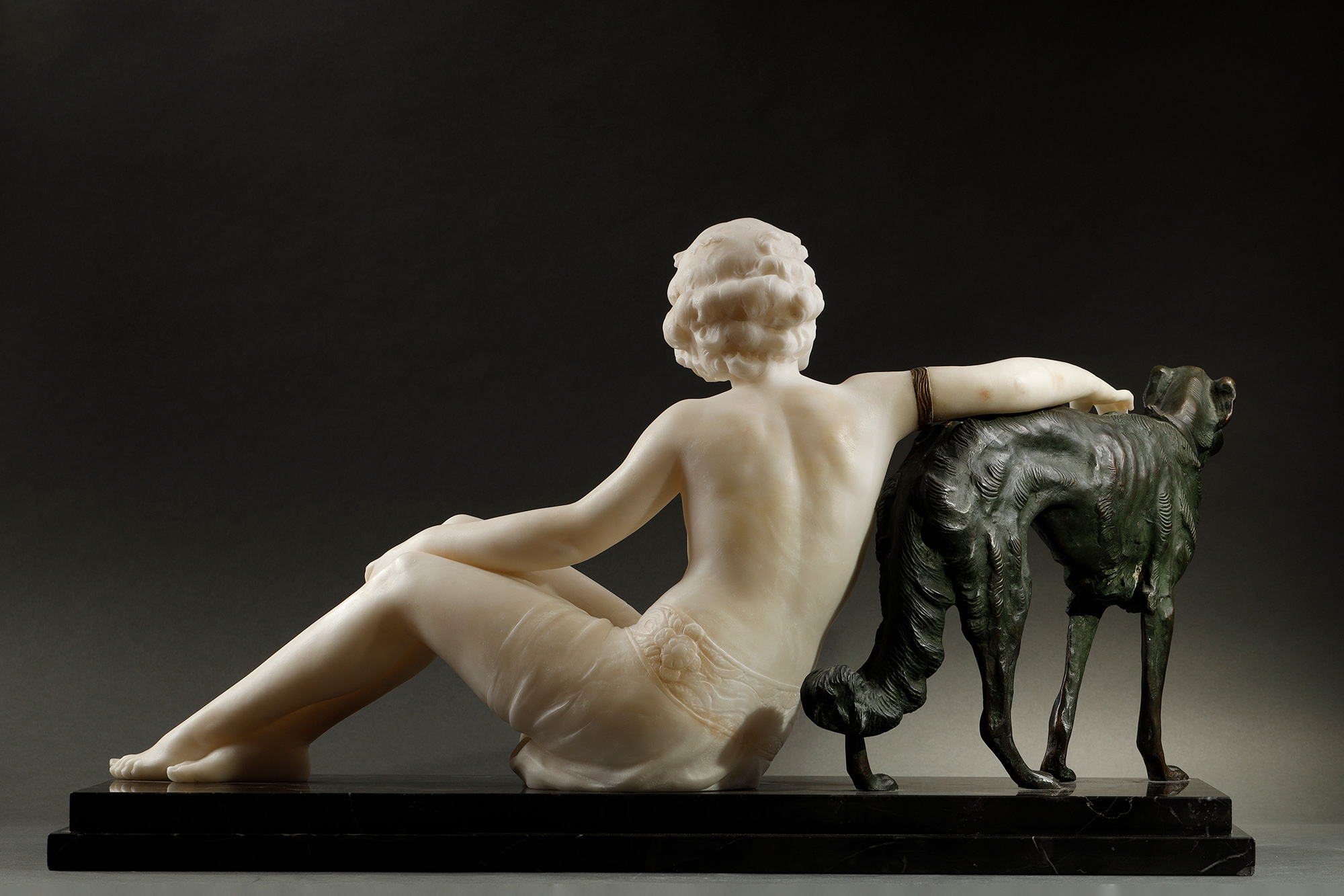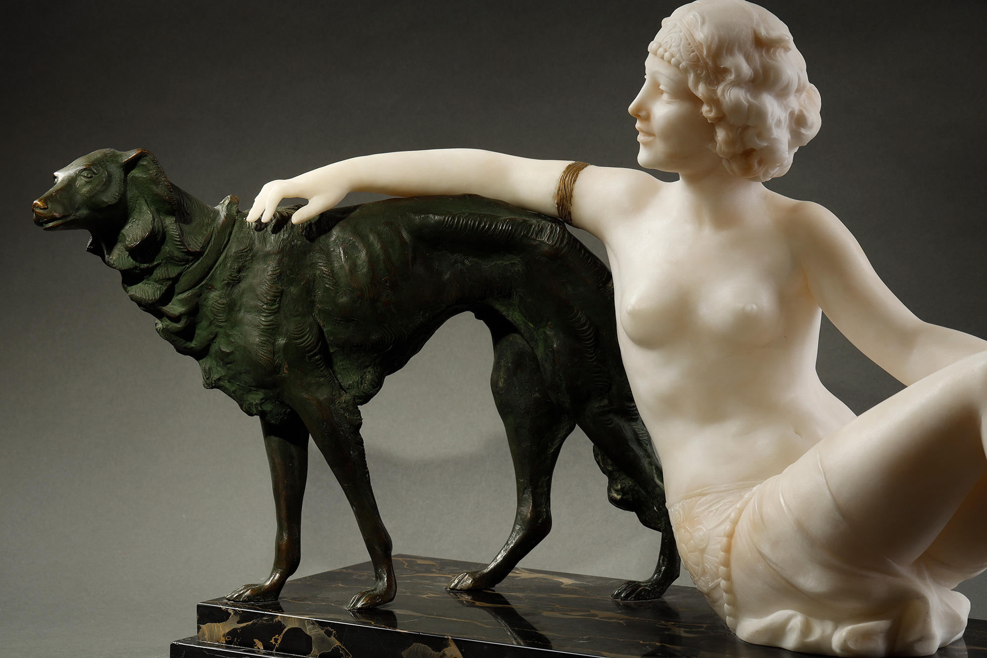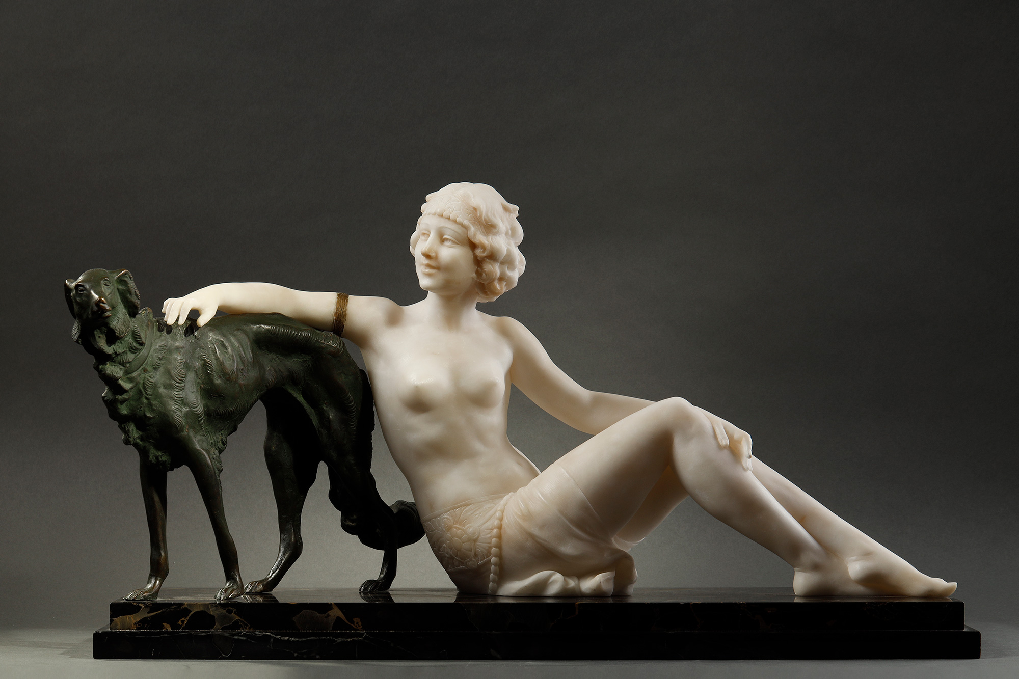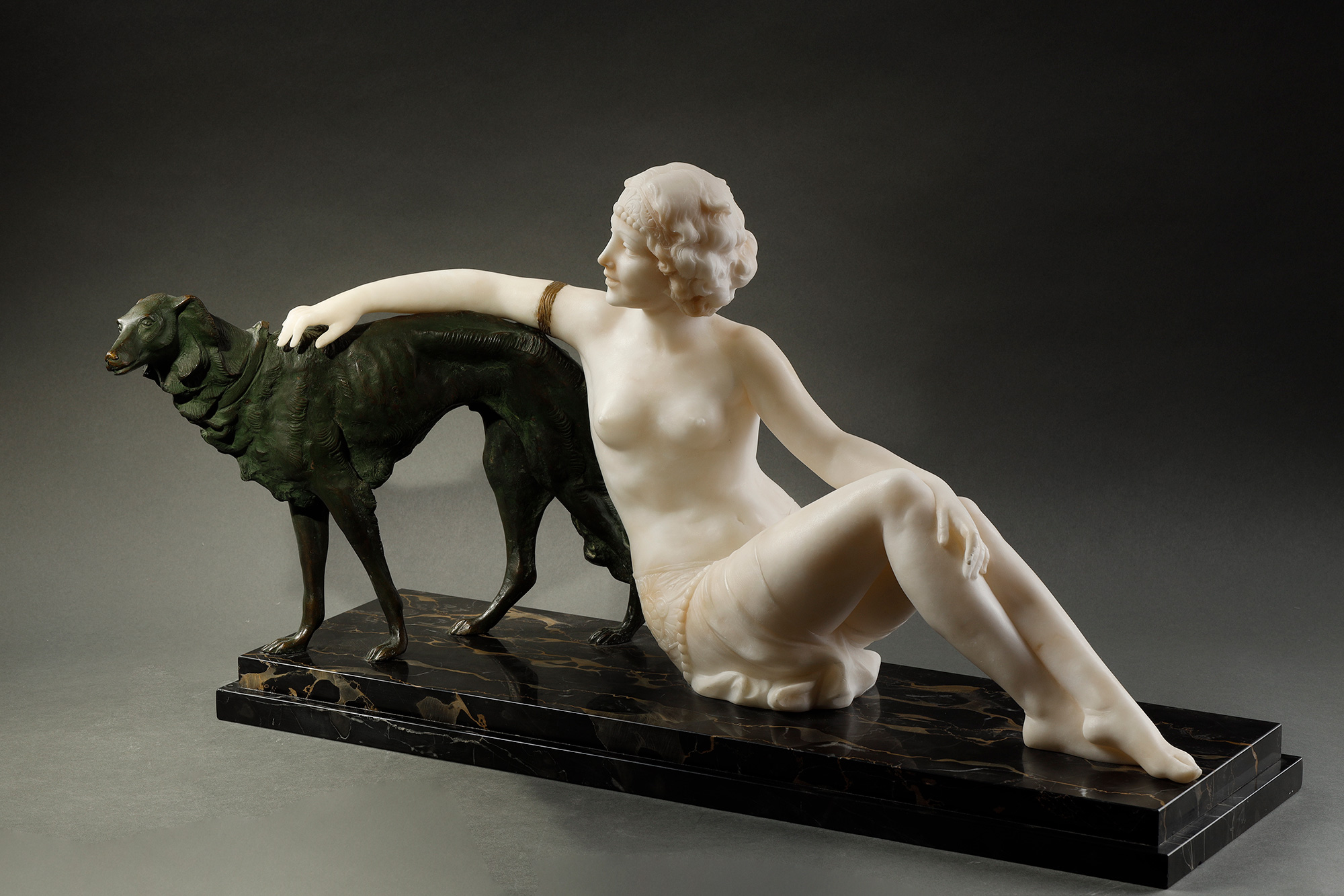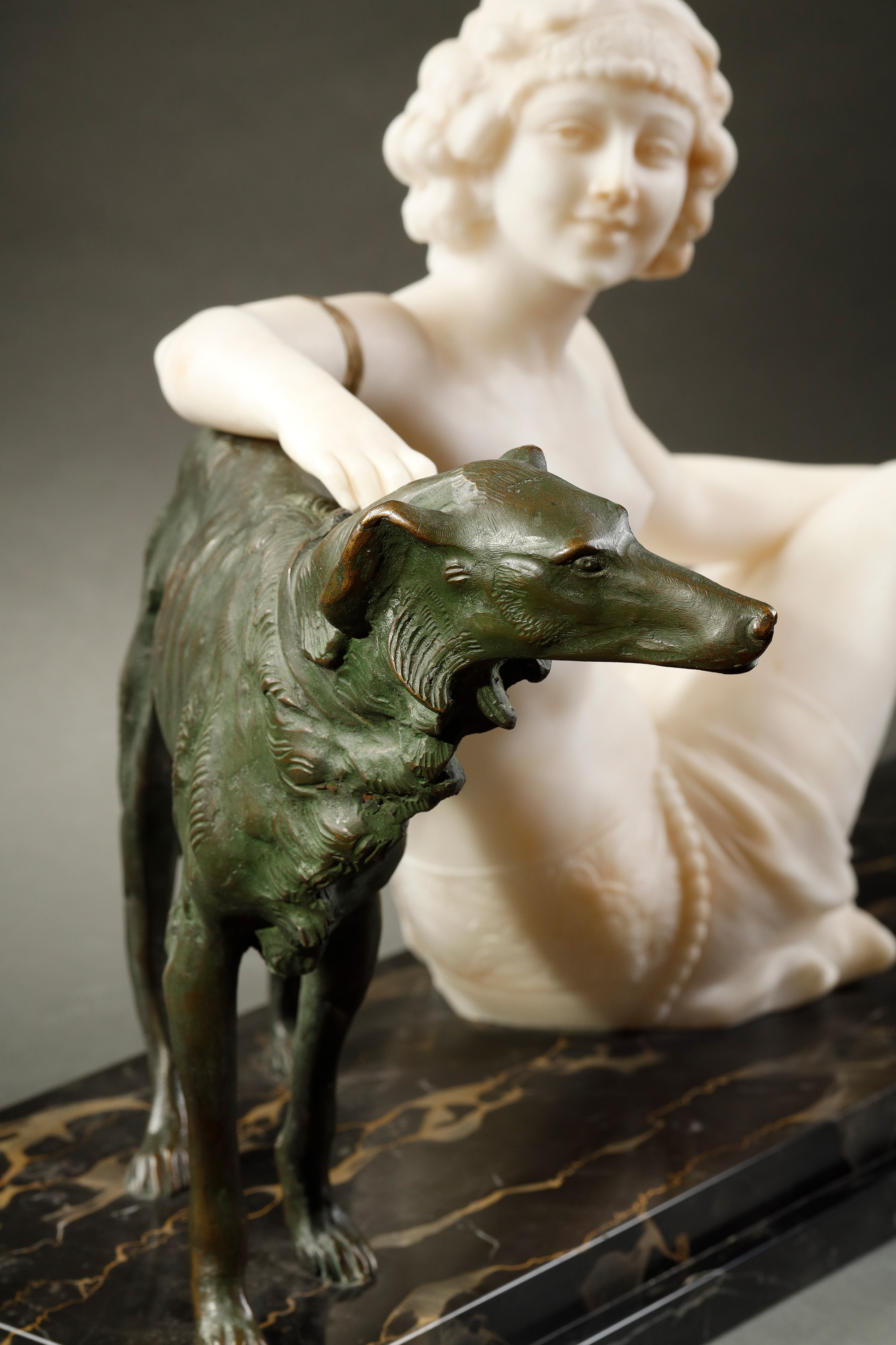 1920年代意大利雕塑家Alberto Saccardi签名创作装饰艺术风格大理石底座装饰青铜及雪花石膏雕塑作品《少女与猎犬》