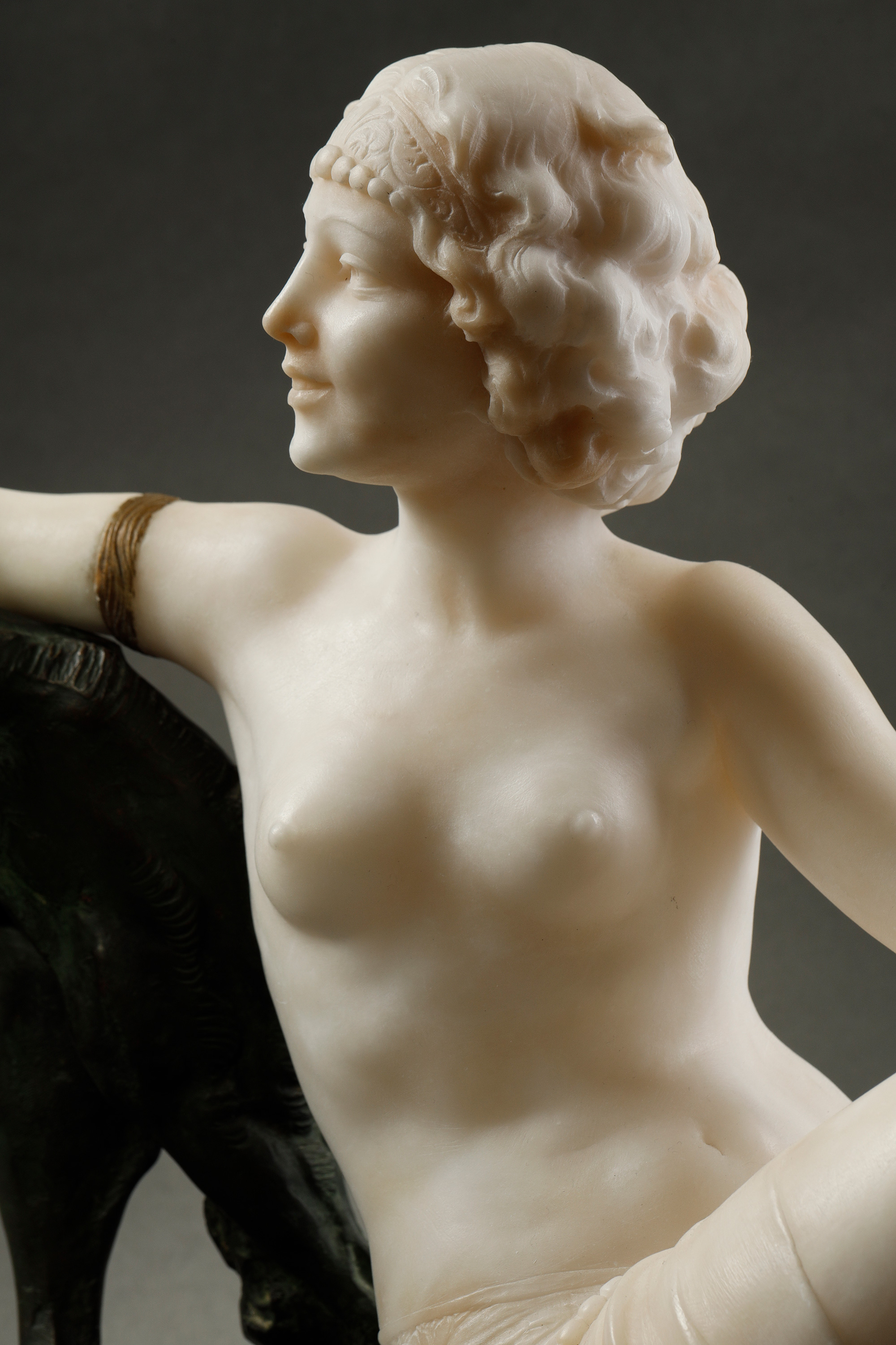 独角鹿西洋古董1920年代意大利雕塑家Alberto Saccardi签名创作装饰艺术风格大理石底座装饰青铜及雪花石膏雕塑作品《少女与猎犬》