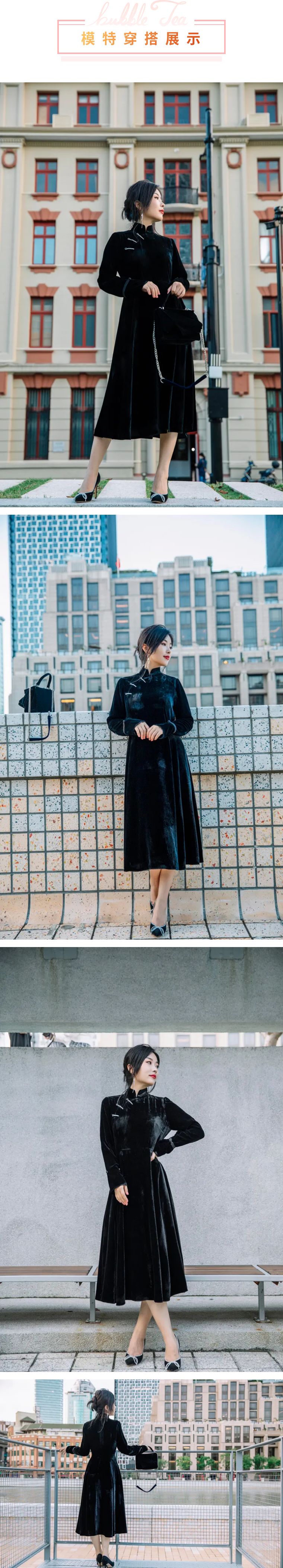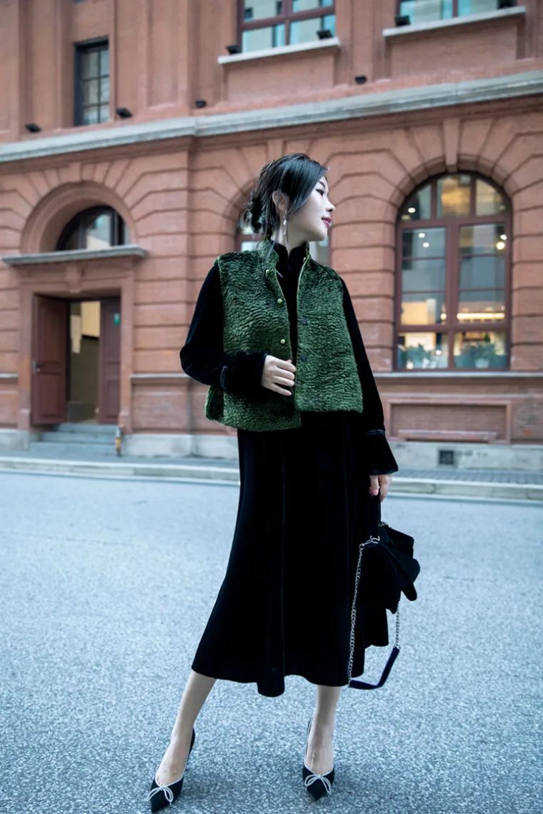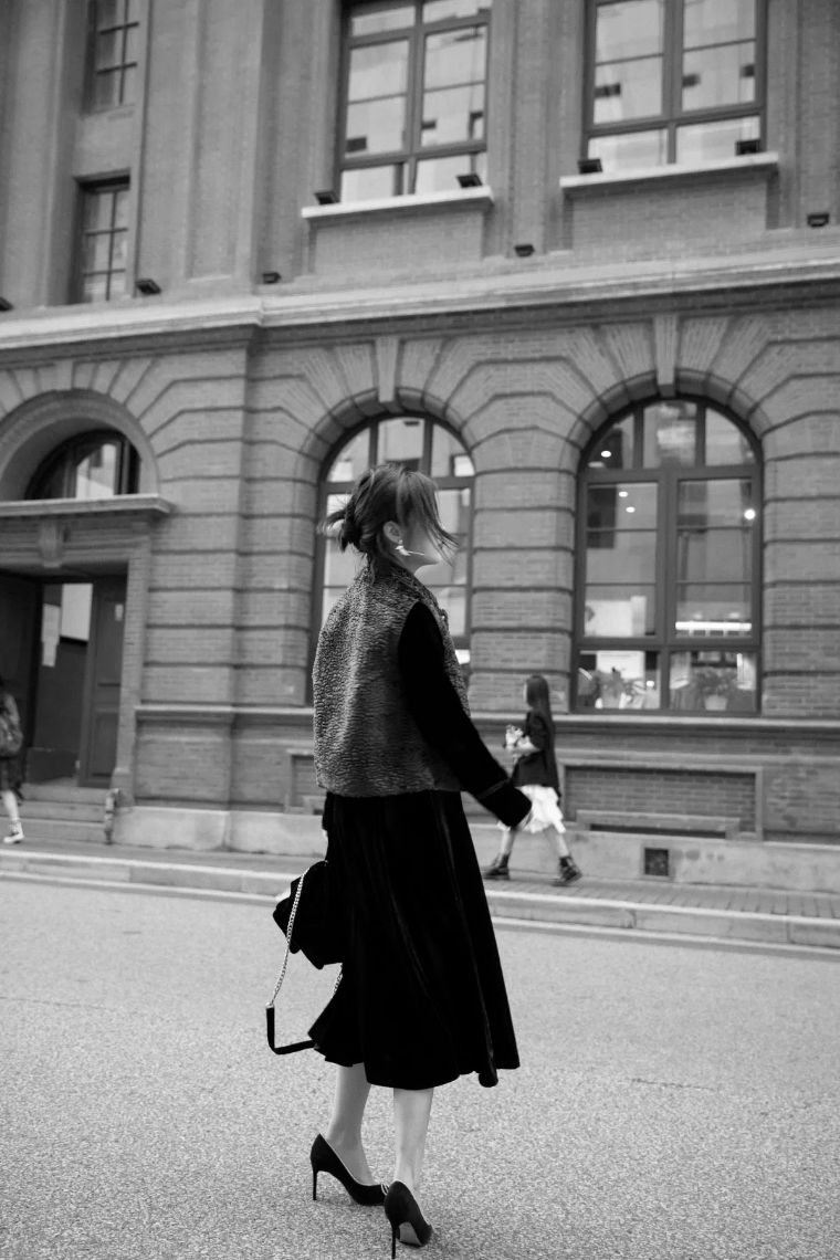 中式丝绒连衣裙对上丝绒蝴蝶结浅口单鞋,充满镐级感的丝绒,无处不透着优雅和精致,和取景地融为一体。