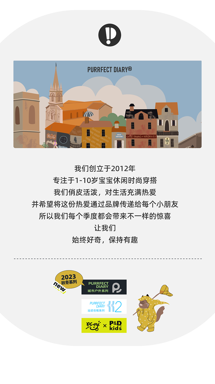 - Purrfect-Diary专注于贴近自然随性的穿着概念,轻奢平价的童装文化传播,在产品设计上更加注重婴童穿着的舒适性、安全性、更出众的国际化品牌,将欧美的育婴文化在中国进行深入的传播与推广。