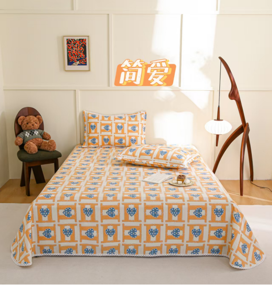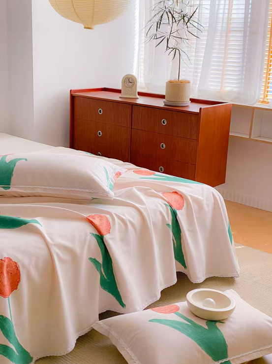 不是滑溜溜的冰冷感,是纯棉肌理、扎实又温柔的触感。摸上去有清晰的纹路,不扎肤,反而像被阳光晒过的踏实包裹感🌞 ✅ 会呼吸的面料 细纱编织自带透气孔,吸汗不粘身,夏天不闷汗、冬天不静电,躺上去干爽一整夜,敏感肌/宝妈/宝宝都能安心裸睡。 ✅ 越洗越软 越用越香 新布挺括有型,洗几次就变得软糯亲肤,质感越养越舒服,不像普通床单越洗越塌。 ✅ 肌理自带按摩感 线粗纹深,天然小按摩点,躺着超解压,睡眠都变踏实了。 ✅ 抗造好打理 耐磨、不易皱、不卷边、那种质朴、温润、有烟火气的质感,是绸缎给不了的安心。 睡在上面,整个人都慢下来,治愈又踏实