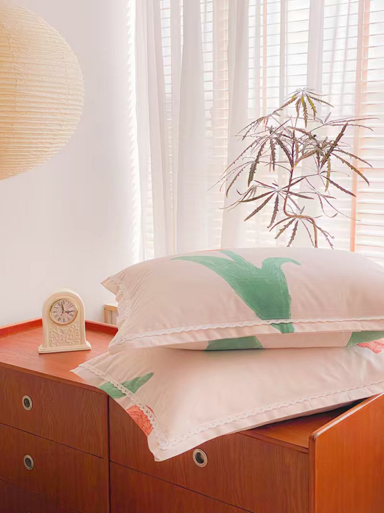 精工细作 有足够的细节 让你挑剔 🔸 高密全棉面料制作,舒适透气性好可裸睡。 🔸 宽边信封枕套,简洁大方,方便换洗。 🔸 圆角花边床单针线细密,一针一线都用心打造,紧密锁边。