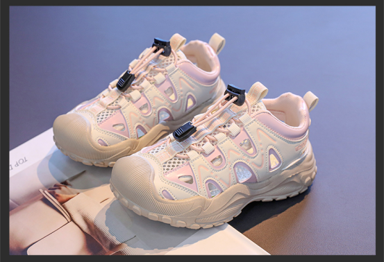 瞧~为了保护孩子的小脚,鞋头采用包裹设计,户外玩耍很安心; 猪鼻扣设计,穿脱贴合方便; 合成革面料为品质加持,大面积镂空保证透气性 双重buff傍身,提升穿着体验!