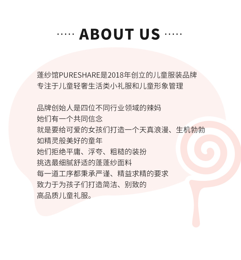 - PureShare蓬纱馆,2018年创立的儿童服装品牌,专注于儿童轻奢生活类小礼服,主张“让孩子做最独特的自己”的品牌理念,为孩子们提供时尚简洁、优雅而又不失童真的生活类礼服。