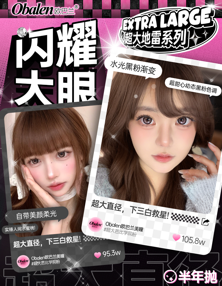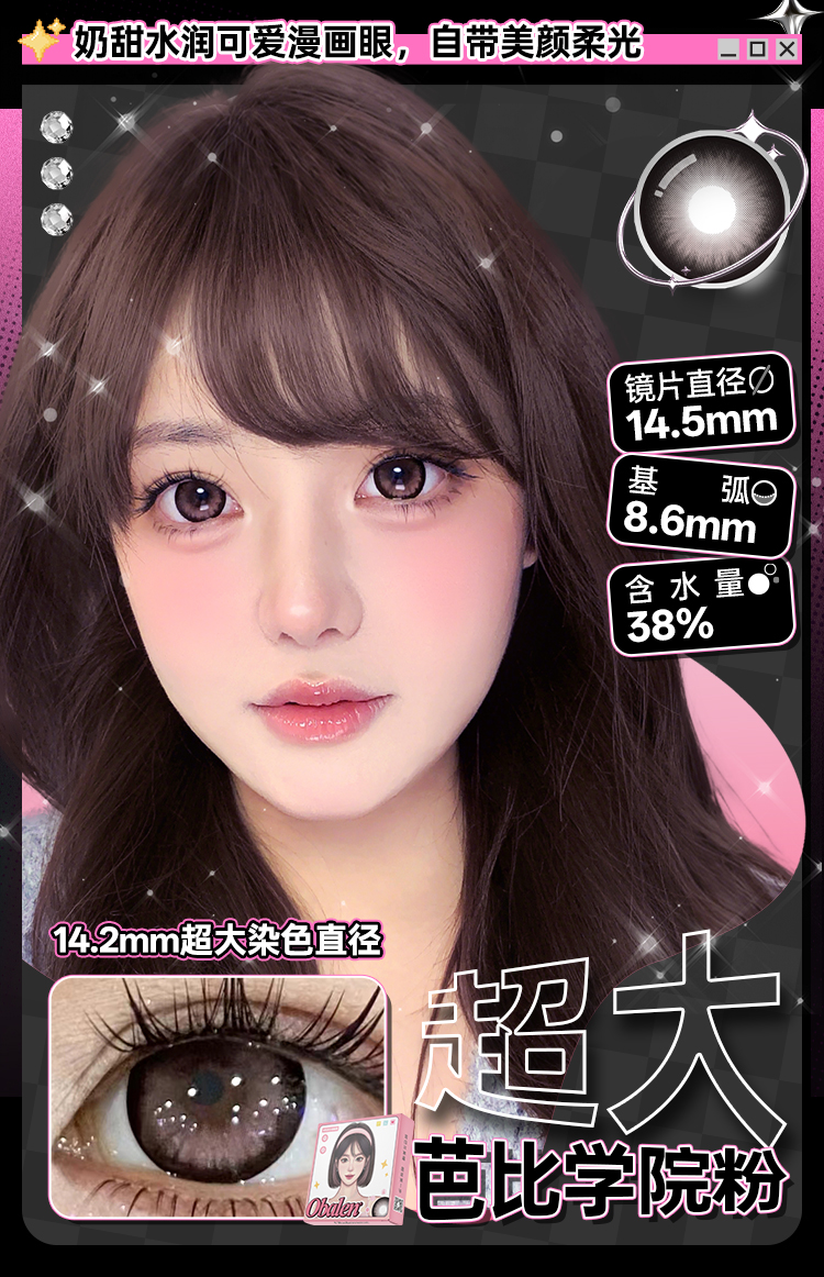 新品【超大地雷方盒系列】超大芭比学院粉14.5【买即送护理液】Obalen欧巴兰无感扩瞳漫画大眼半年抛2片装