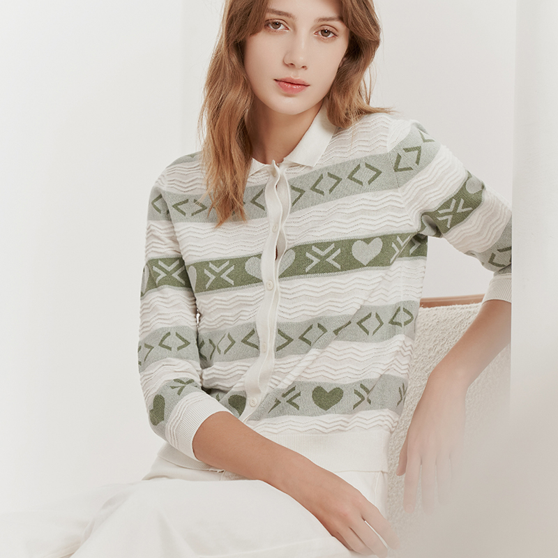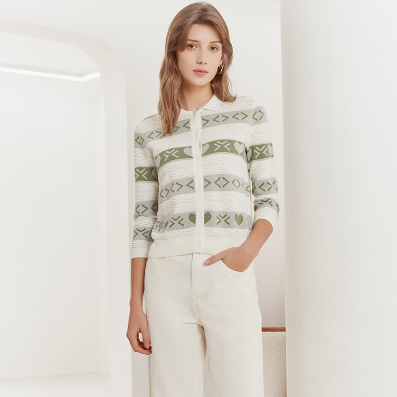 【方领七分袖针织开衫】23年春夏新品女士七分袖条纹印花针织开衫小外套