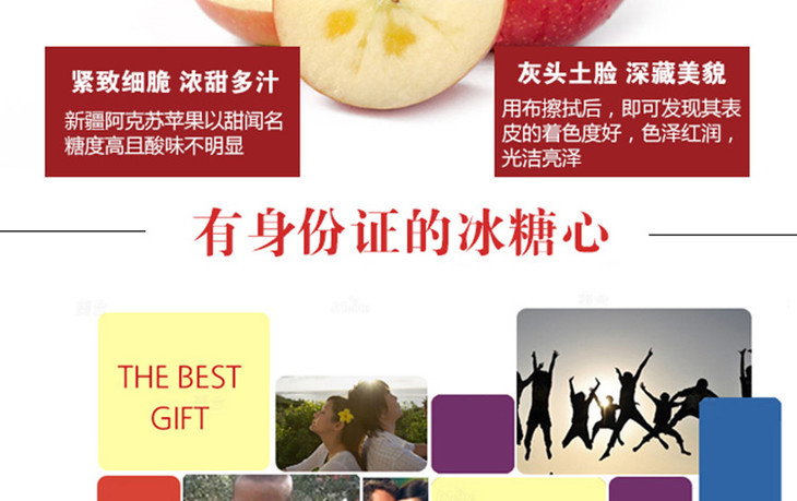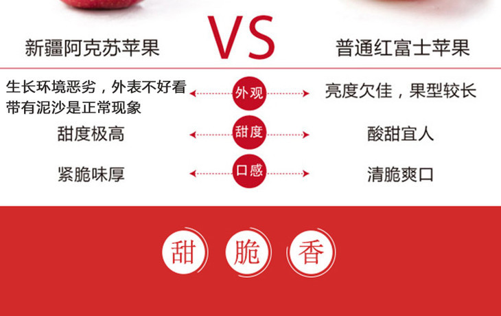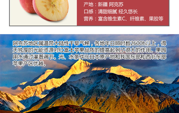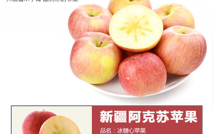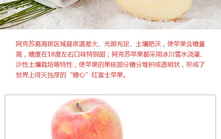 【产品规格】阿克苏苹果:4.8-5.1斤中果(约10-12枚左右),4.8-5.1斤大果(约8-9枚左右),8.5-9斤中果(约20-24枚左右),8.5-9斤大果(约16-18枚左右)。