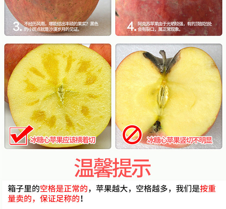 2.糖心苹果不是品种,是因高原昼夜温差大而产生的现象,糖心不会每颗果子都有,糖心的有无、深浅,都不影响口感,介意勿拍。