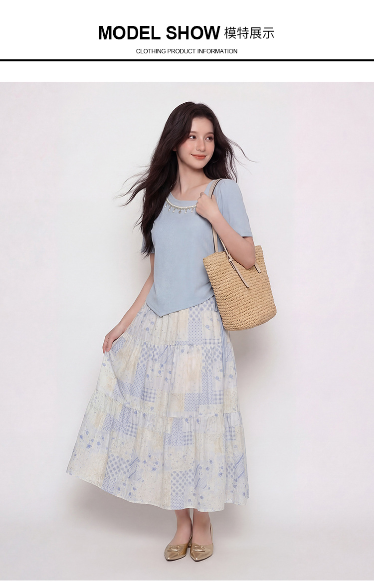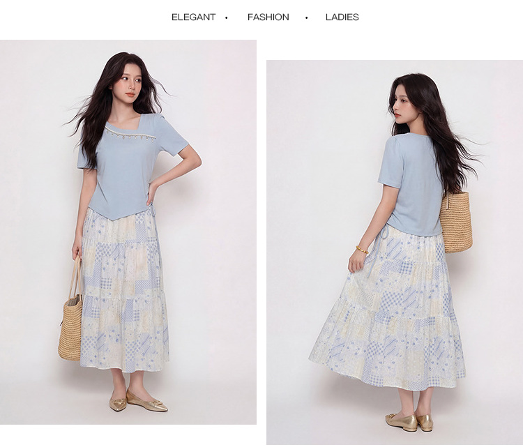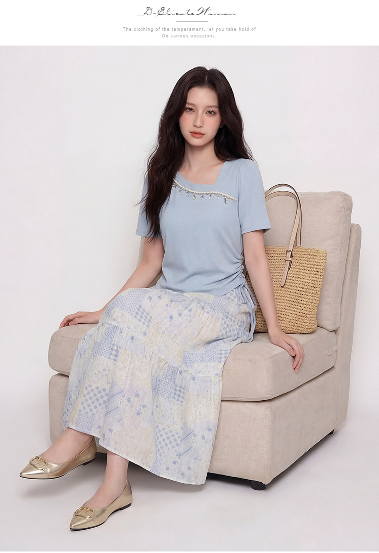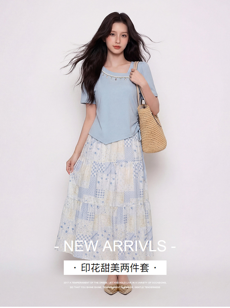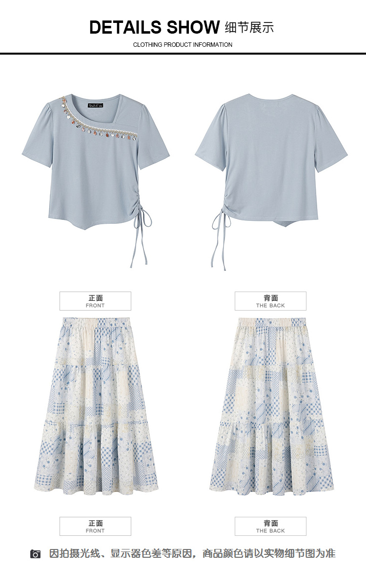 奢姿大码女装2026夏季抽绳减龄印花两件套胖妹妹斜领甜美时尚套装9962994566