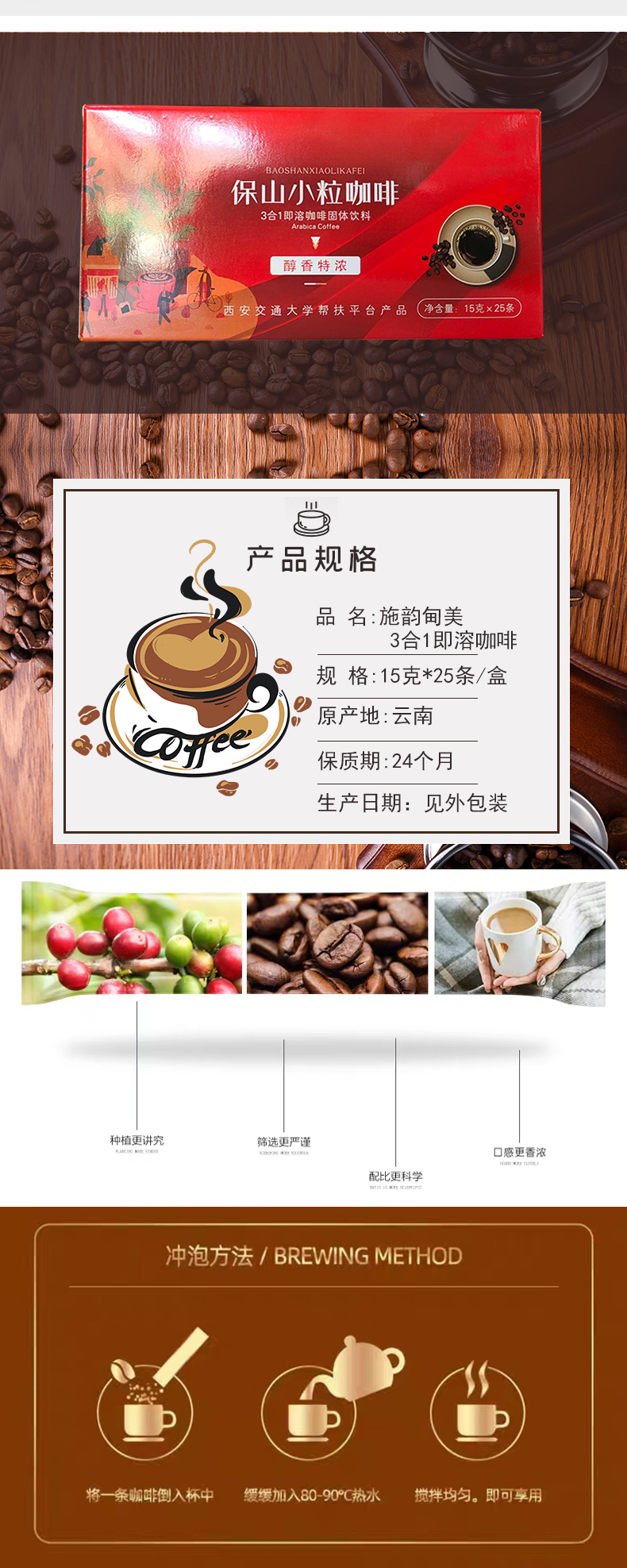 云南保山速溶咖啡六种口味混装、醇香特浓、卡布奇诺、丝滑摩卡、海盐拿铁、烂漫奶香、经典原味(三合一)