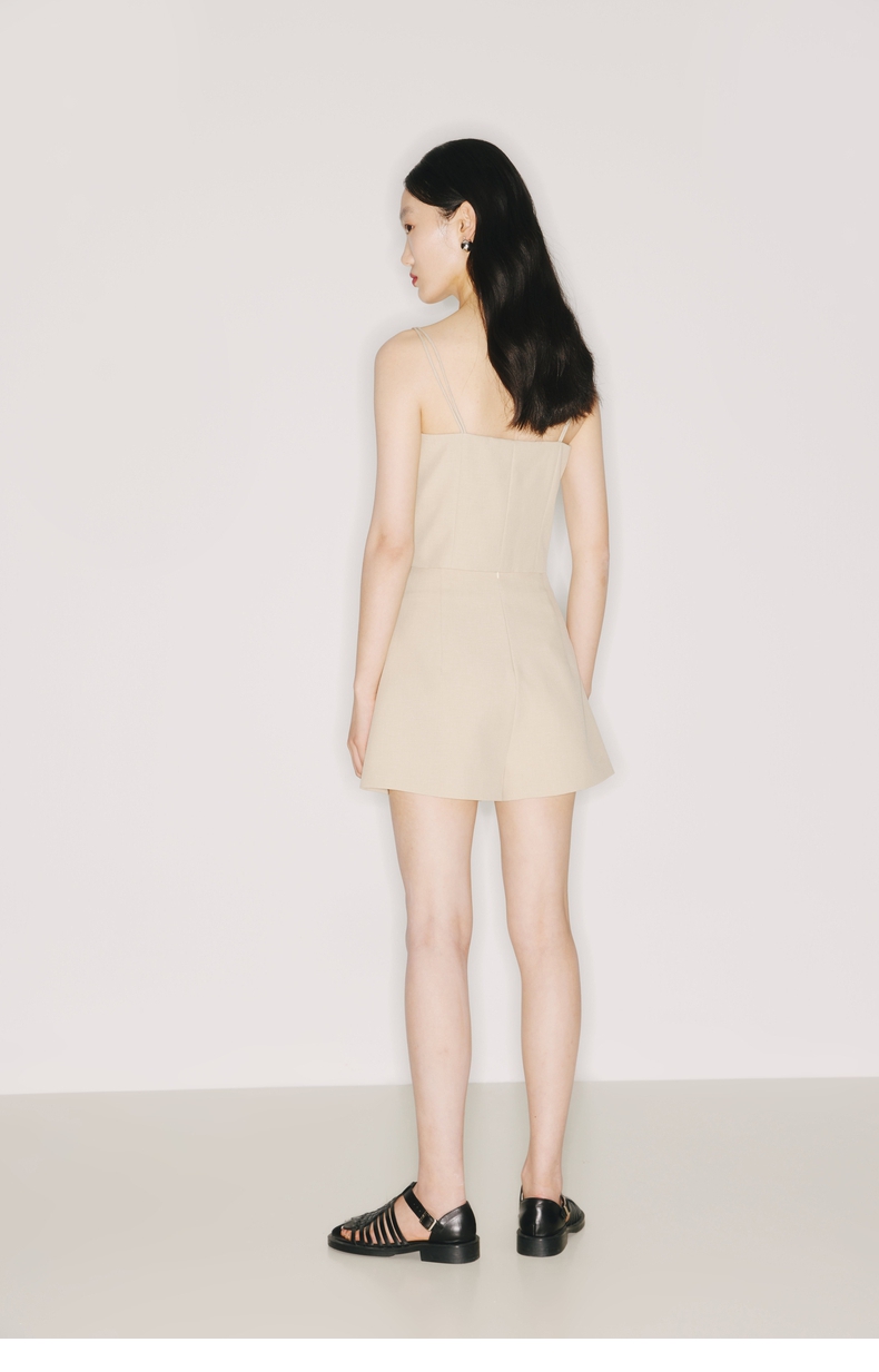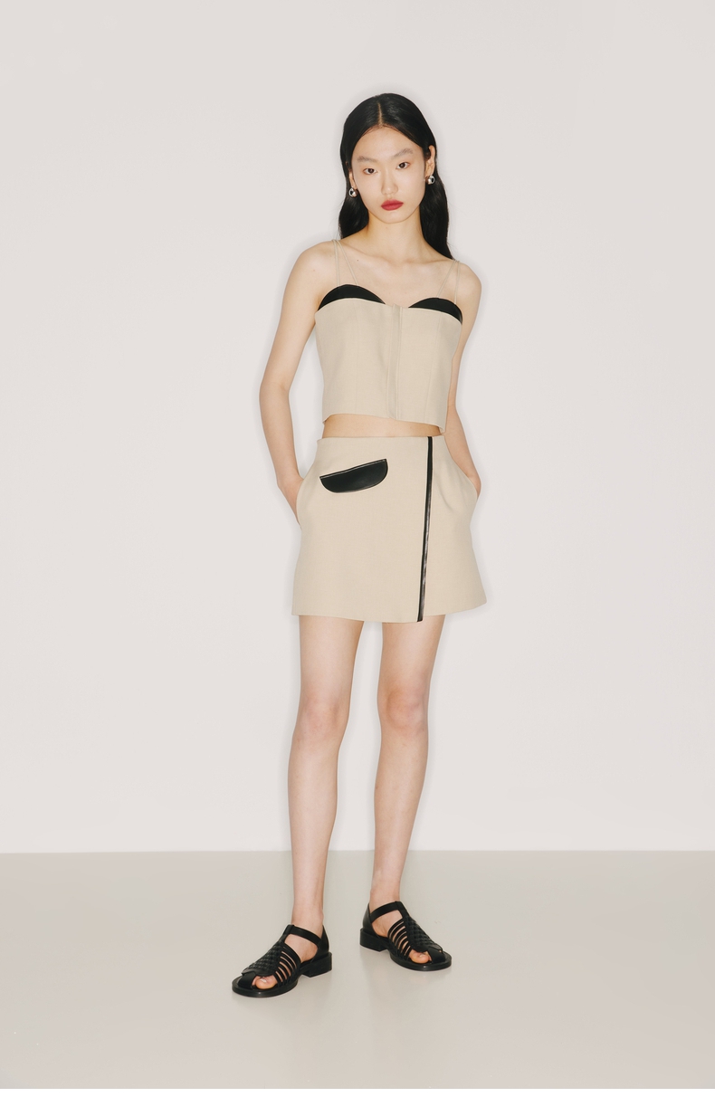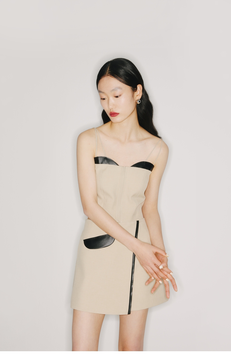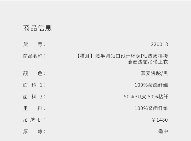 【猫耳】浅半圆领口设计环保PU皮质拼接燕麦浅驼吊带上衣/220018