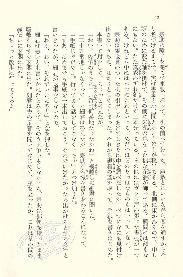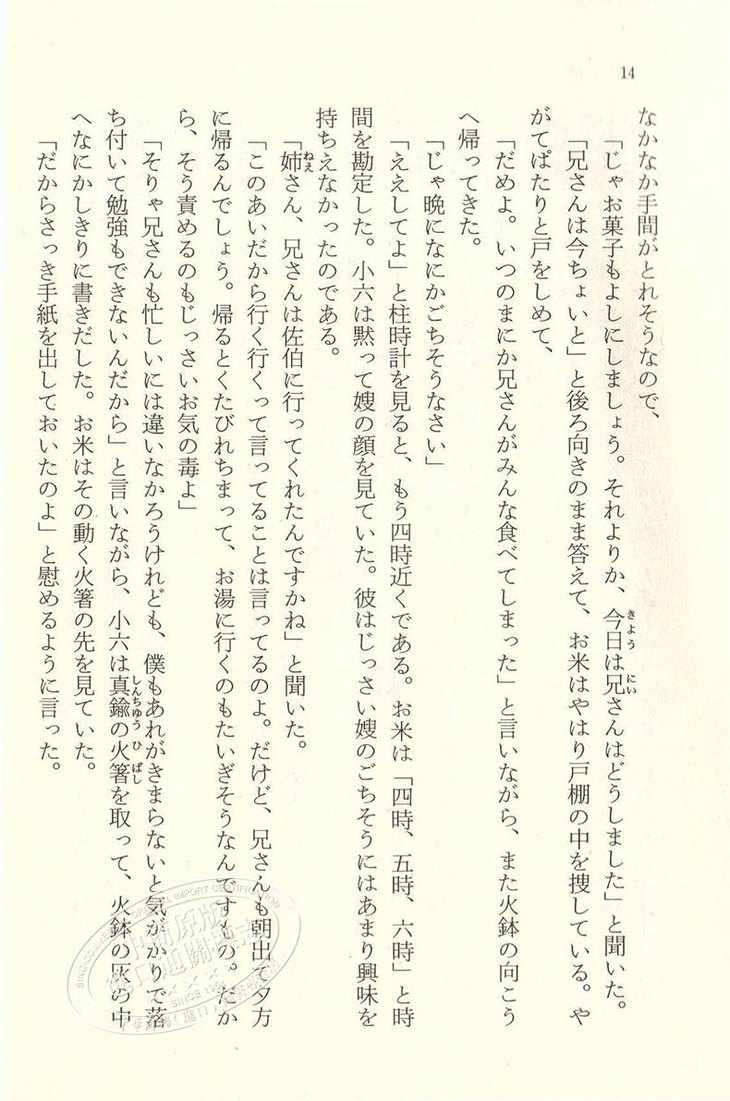 他人の犠牲で成立した宗助とお米の愛。やがて罪の苦しみにおそわれる。宗助は禅寺の山門をたたくが、安心と悟りは得られない。そこに真の意味の求道者としての漱石の面目がある。(荒 正人/塩谷 賛)
