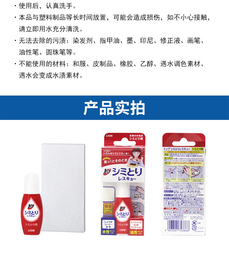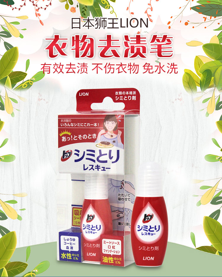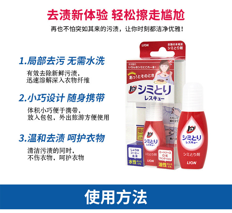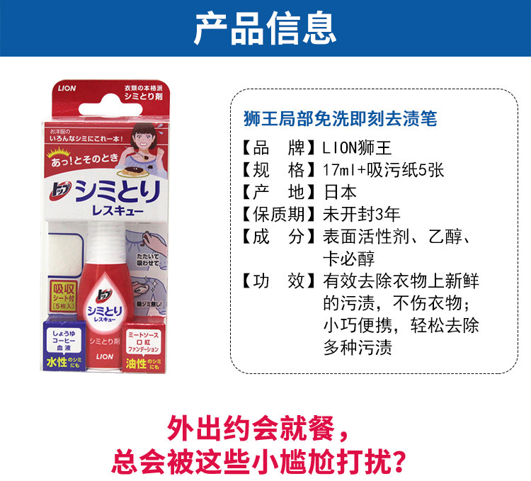 日本狮王衣物清洁干洗剂去渍笔17ml/112349 应急湿清洁剂除油污口红免洗便携式