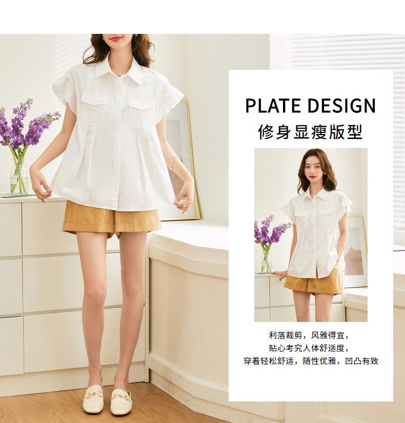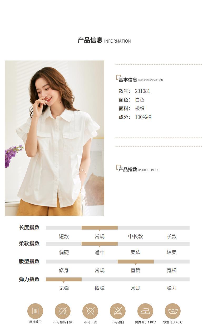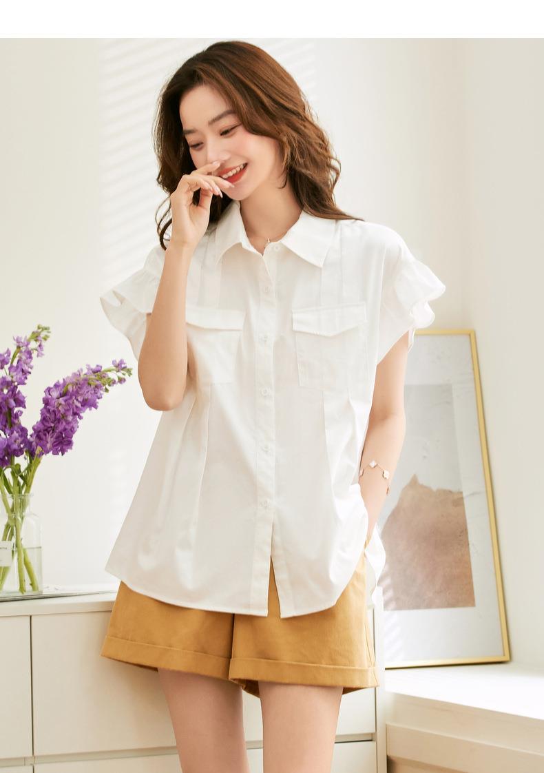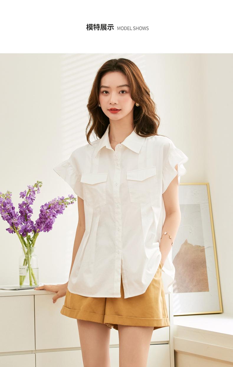 百姿 纯棉荷叶袖衬衫女2023夏季新款翻领百搭通勤短袖女式衬衫