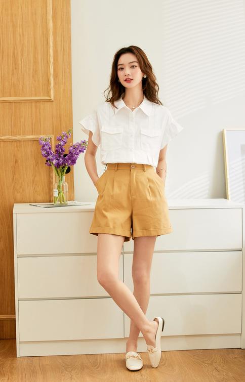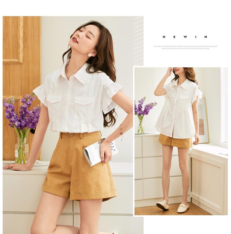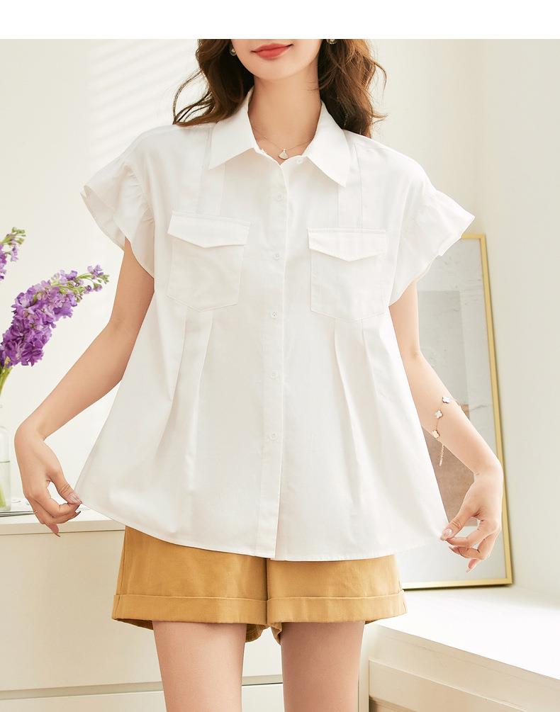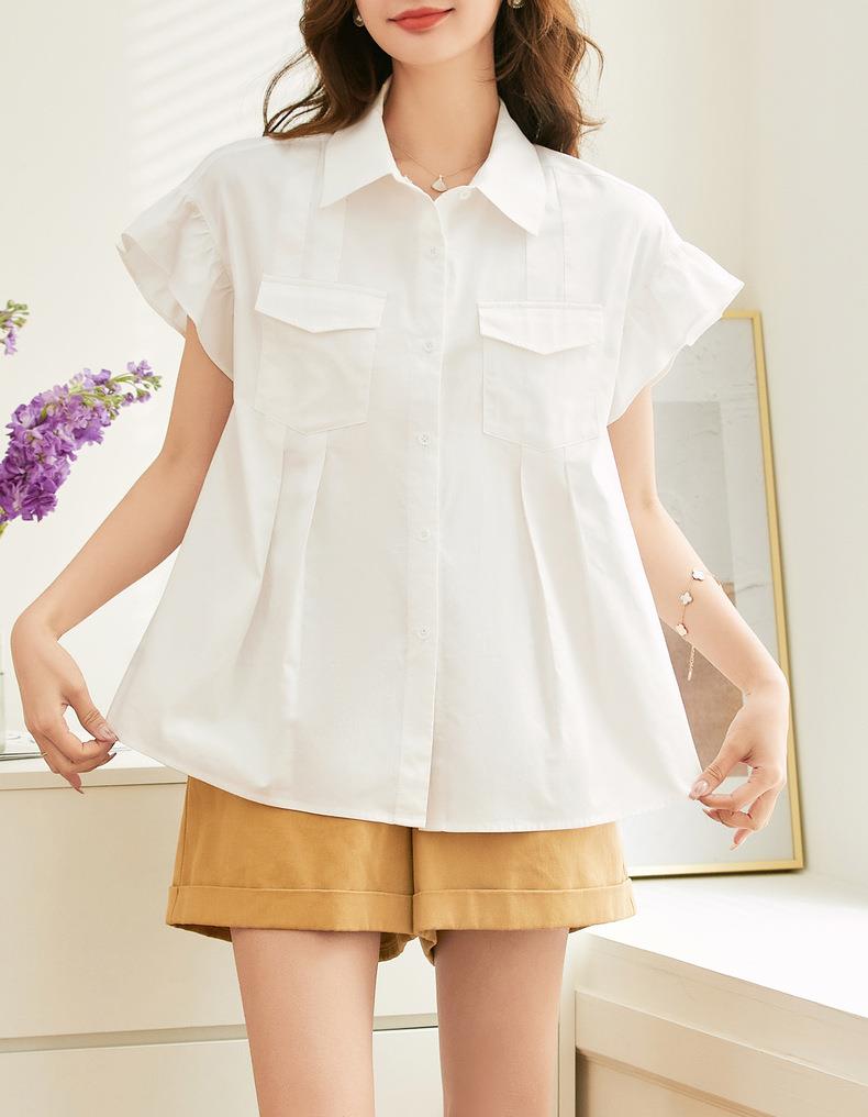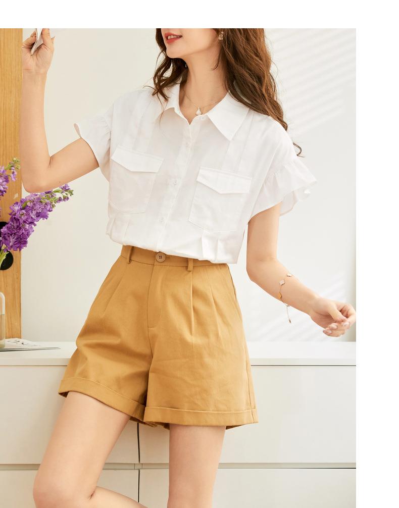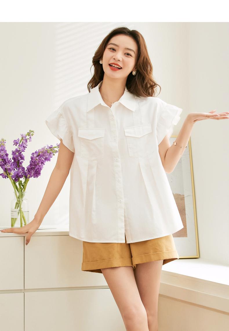 百姿 纯棉荷叶袖衬衫女2023夏季新款翻领百搭通勤短袖女式衬衫