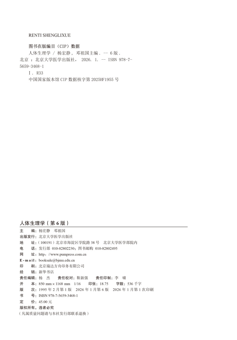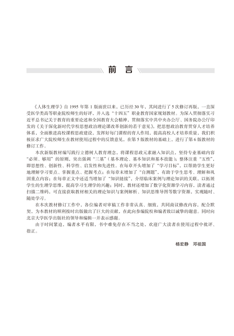人体生理学 第6六版 十四五卫生高等职业教育专科校院合作“双元”规划教材 杨宏静 邓祖国 主编 9787565934681北京大学医学出版社